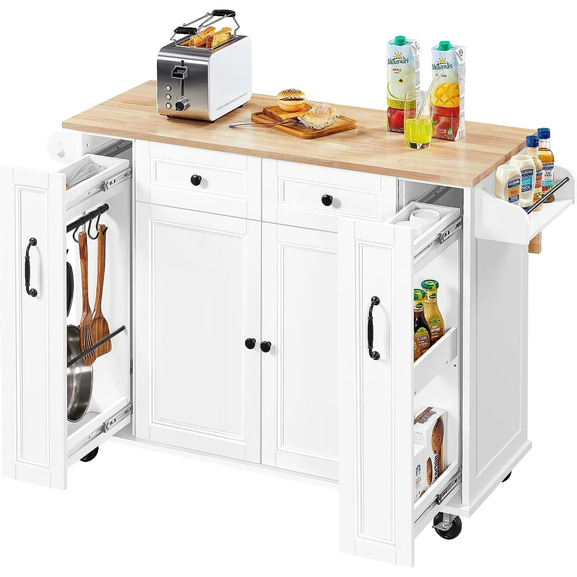 KEMANHUAN Kitchen Cart with Drop-Leaf Rubberwood Top, Rolling Kitchen Island with 2 Side Pull-outs & 2 Drawers & Spice Rack, Kitchen Storage Cabinet on Wheels for Dinning Room, 52 Inch Width, White