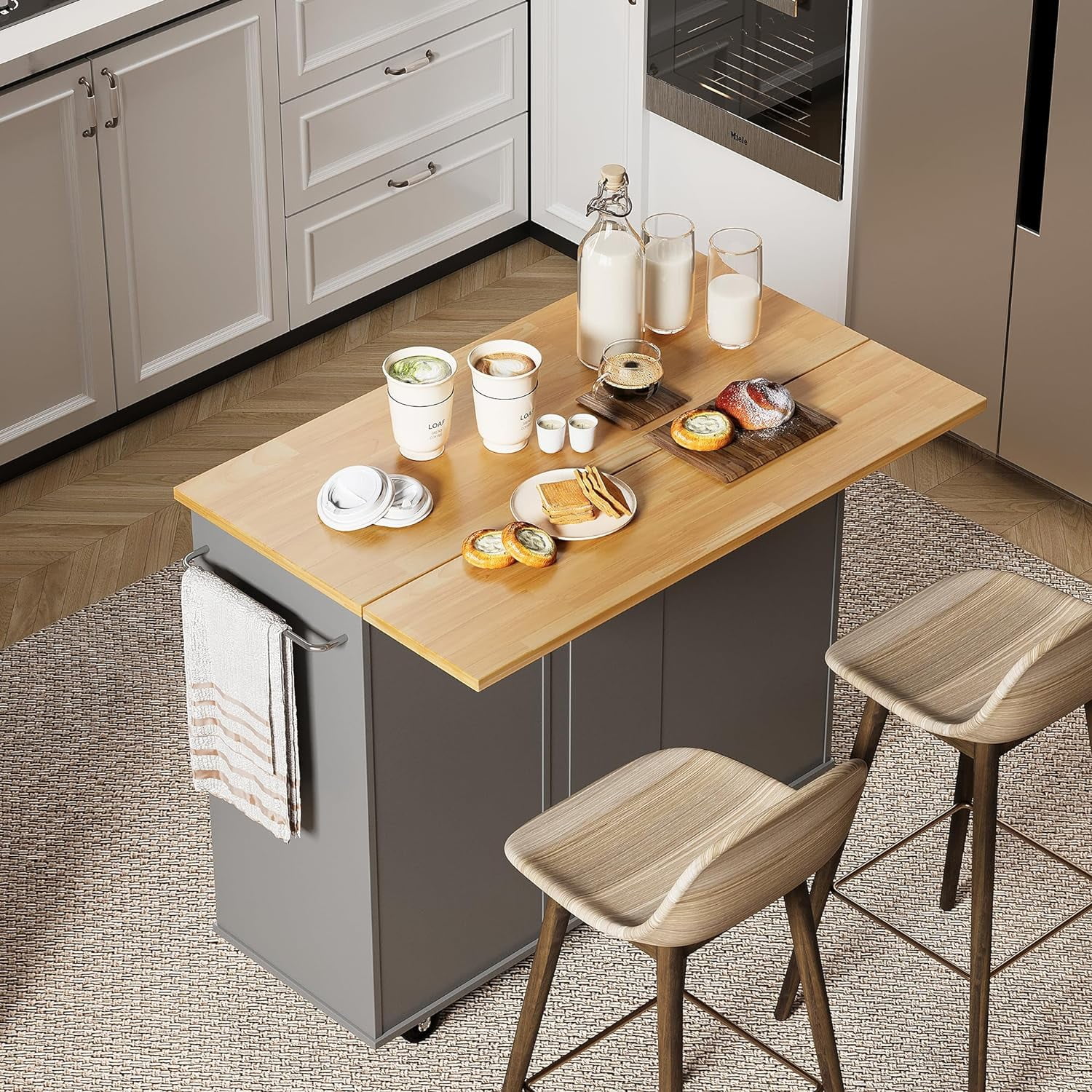 KEMANHUAN Rolling Kitchen Island Cart with Folding Drop Leaf Breakfast Bar, Portable Trolley Island with Large Storage Cabinet, Shelf and Drawer, Gray