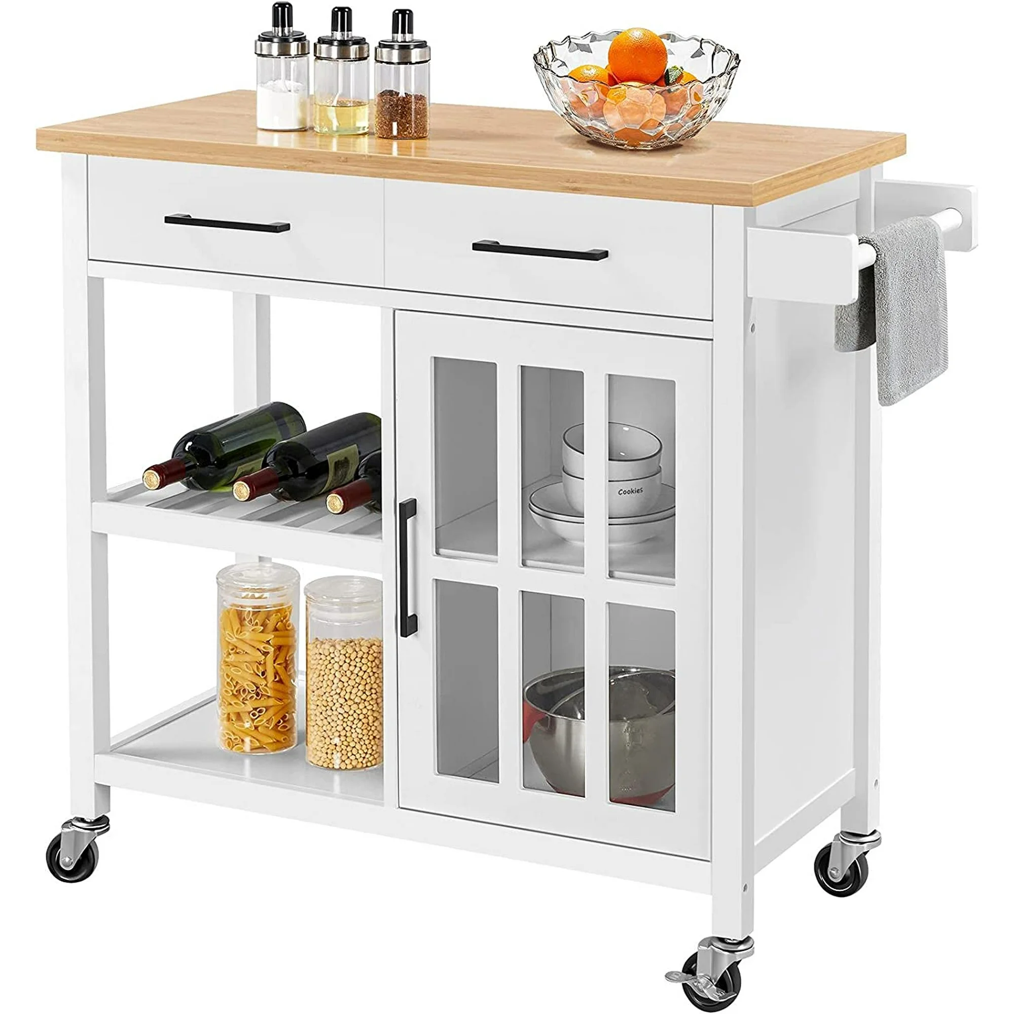KEMANHUAN Kitchen Island on Wheels with Drawers, Rolling Kitchen Cart with Tempered Glass Storage Cabinet Door, Bamboo Top, 2 Tiers Shelves, and Towel Rack, 40x18x36 Inches, White