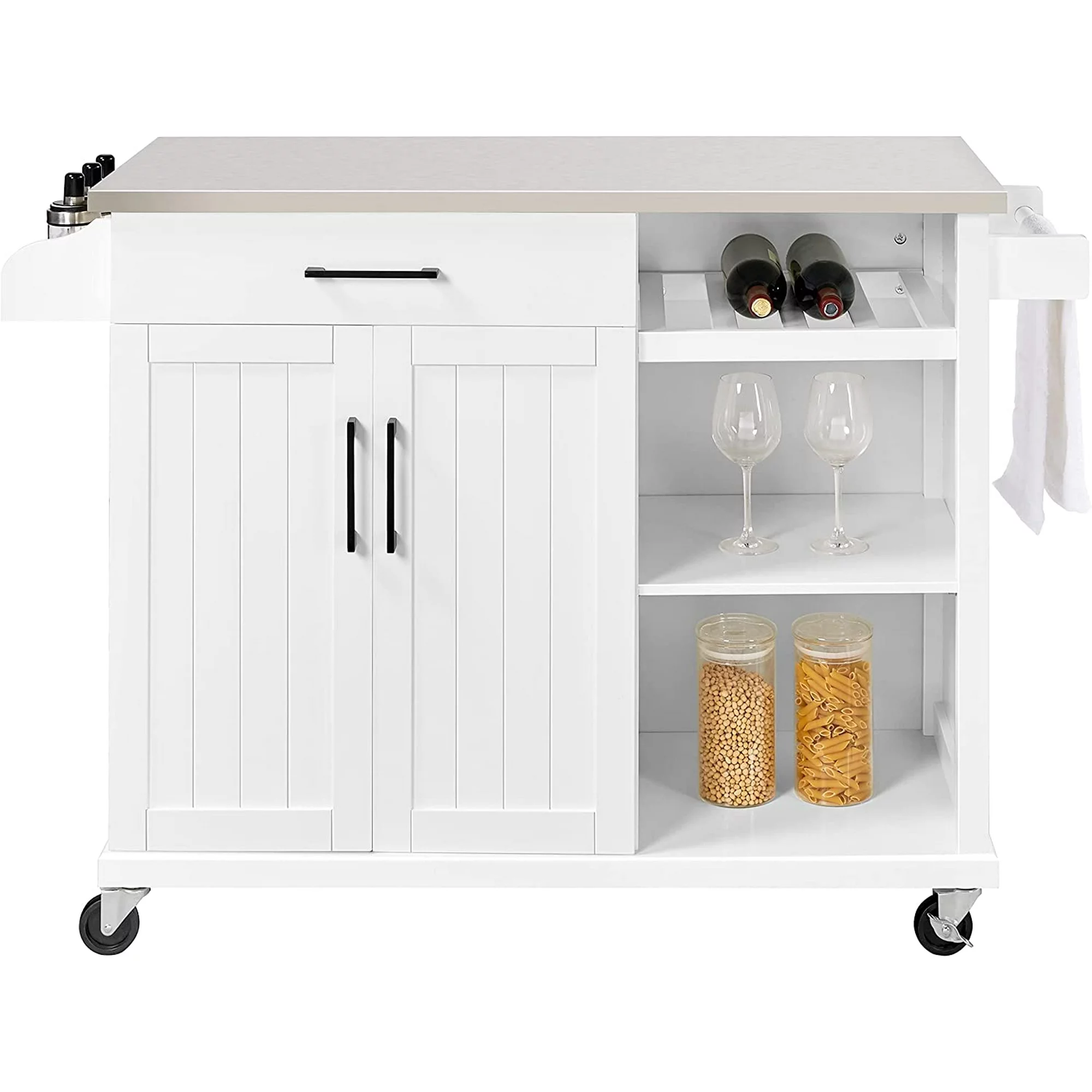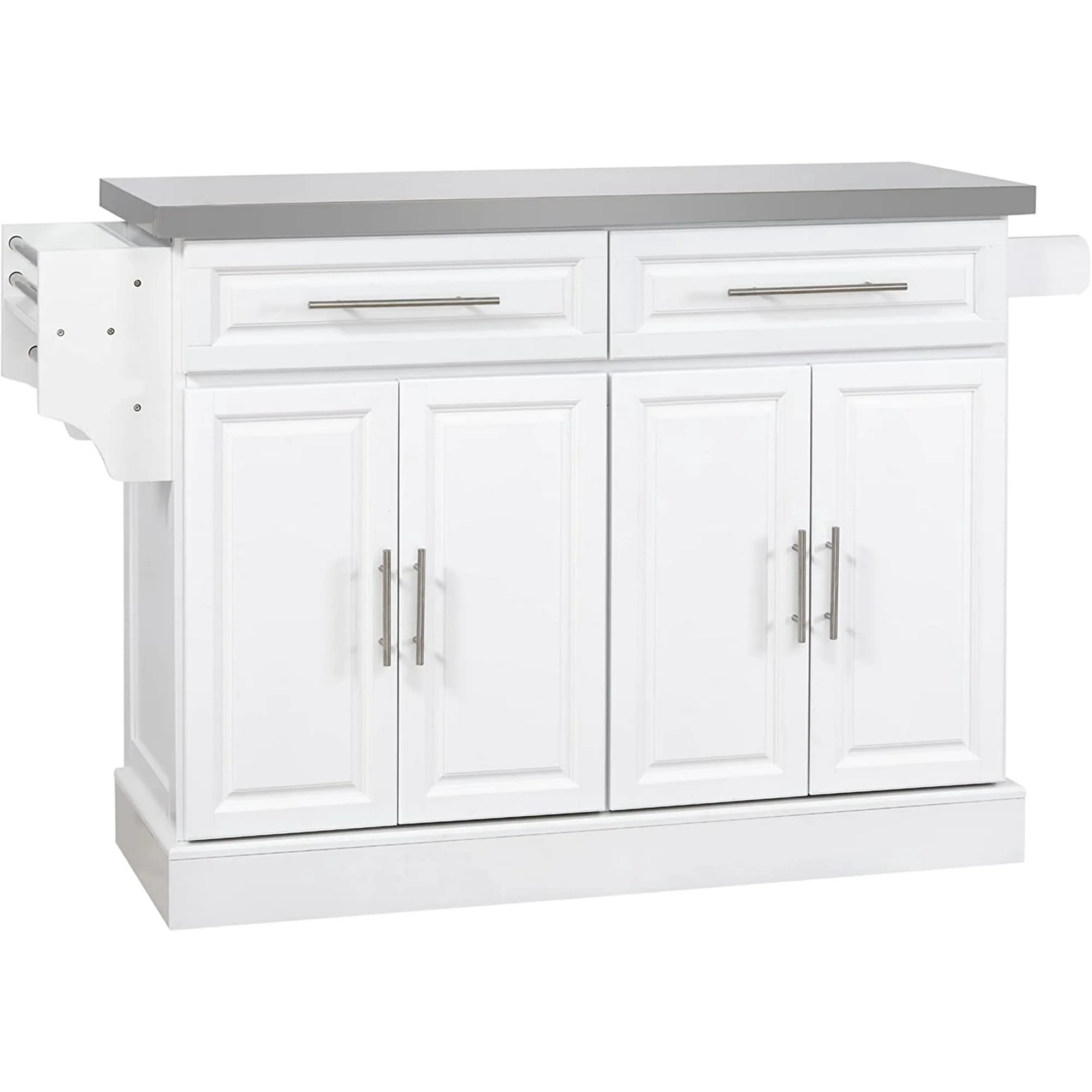 KEMANHUAN Rolling Kitchen Island with Storage, Portable Kitchen Cart with Stainless Steel Top, 2 Drawers, Spice, Knife and Towel Rack and Cabinets, White