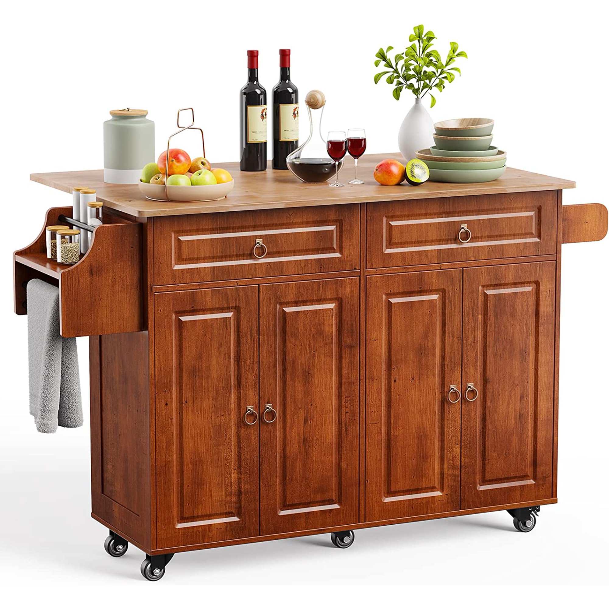 KEMANHUAN Kitchen Island with Drop Leaf and Storage, on Wheels Two Drawers, Large Storage Cabinet, Towel Rack Spice Cart Brown