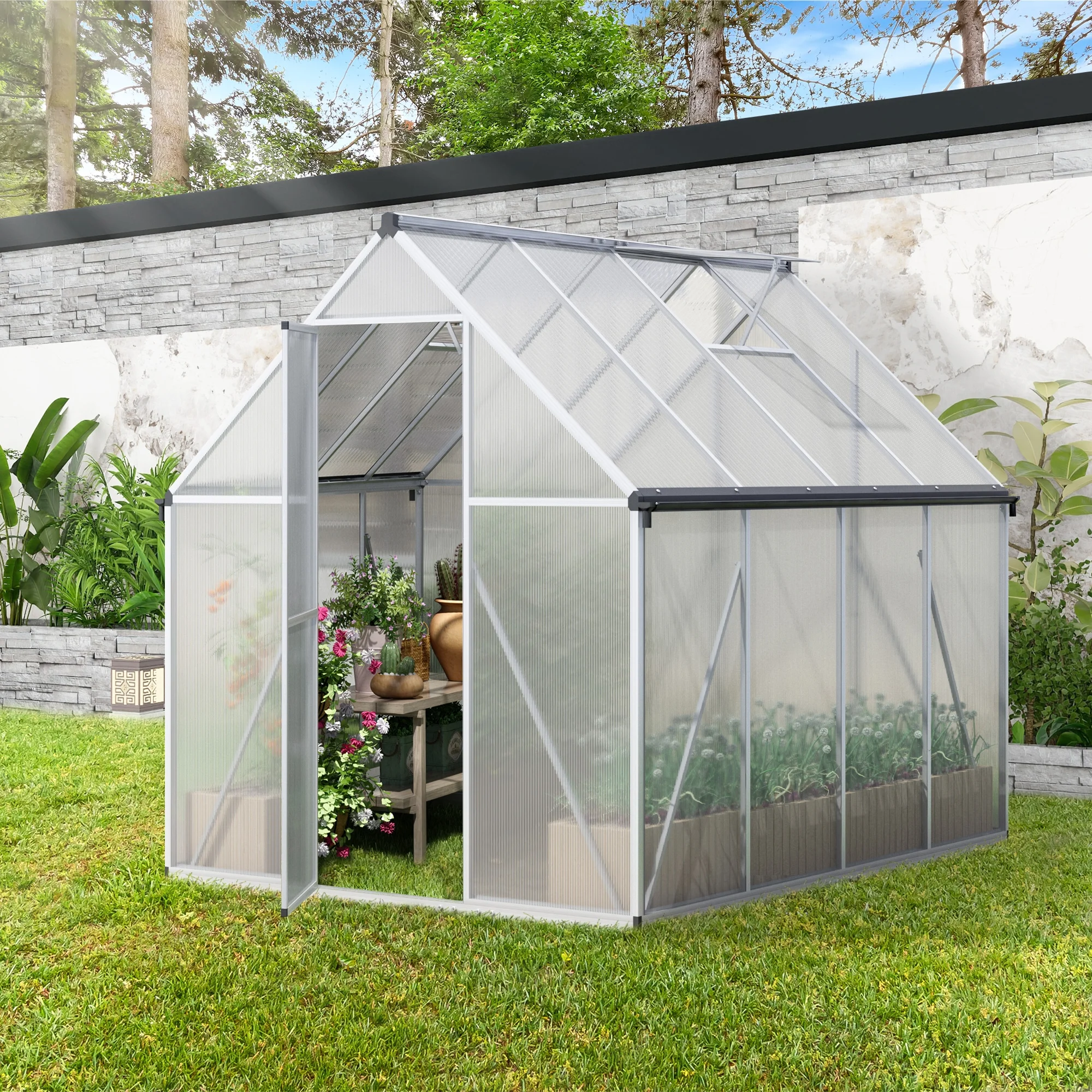Kepooman Outdoor Garden Shed,Large Storage Sheds,6x8 FT Polycarbonate Greenhouse, Outdoor Walk-in Green House with Vent Window, Hinged Door, Rain Gutter, Heavy-Duty Aluminum Hot House