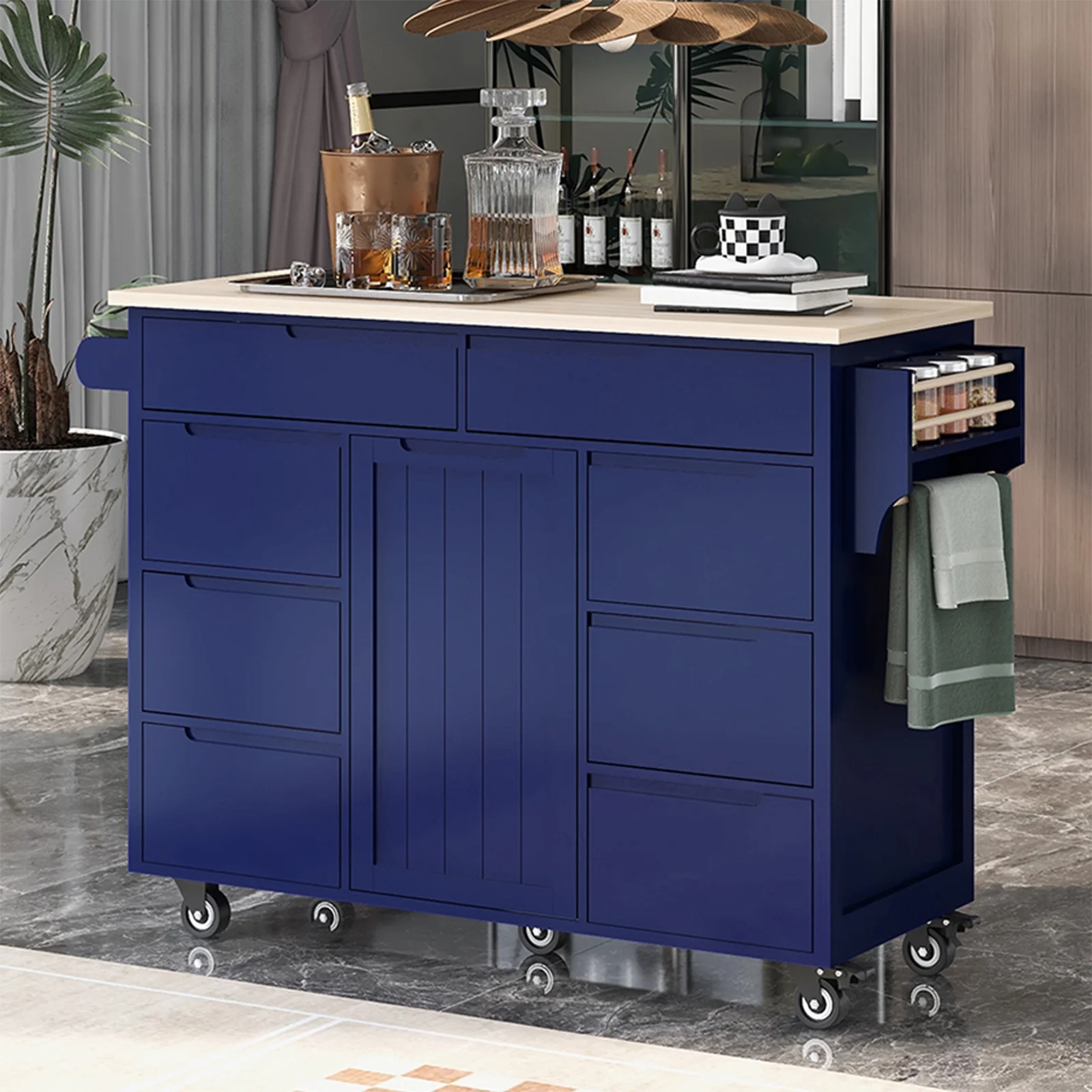 Kitchen Cart with Rubber Wood Countertop , Kitchen Island has 8 Handle-Free Drawers Including a Flatware Organizer and 5 Wheels for Kitchen Dinning Room, Dark Blue