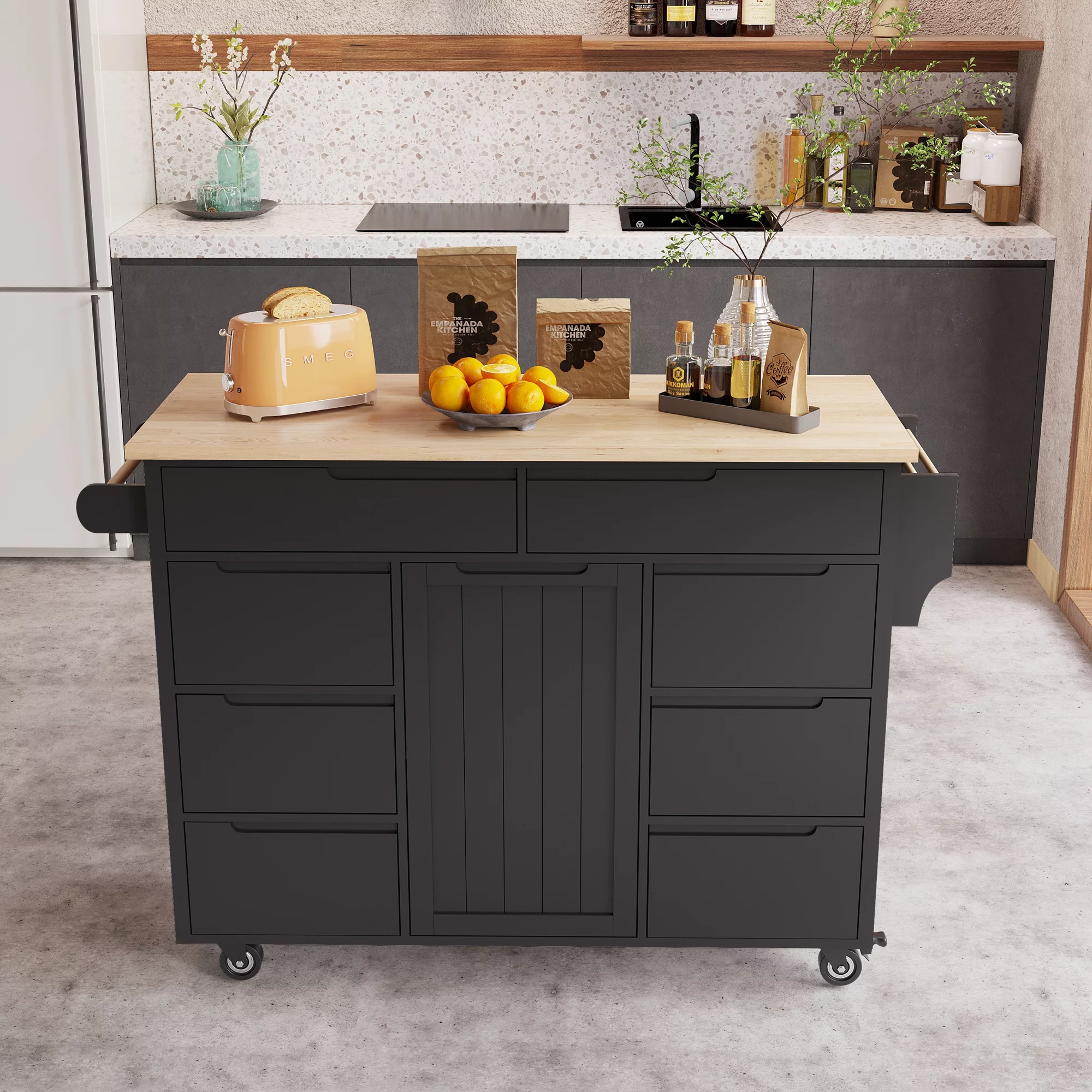 Kitchen Cart with Rubber Wood Countertop , Kitchen Island has 8 Handle-Free Drawers Including a Flatware Organizer and 5 Wheels for Kitchen Dinning Room, Black