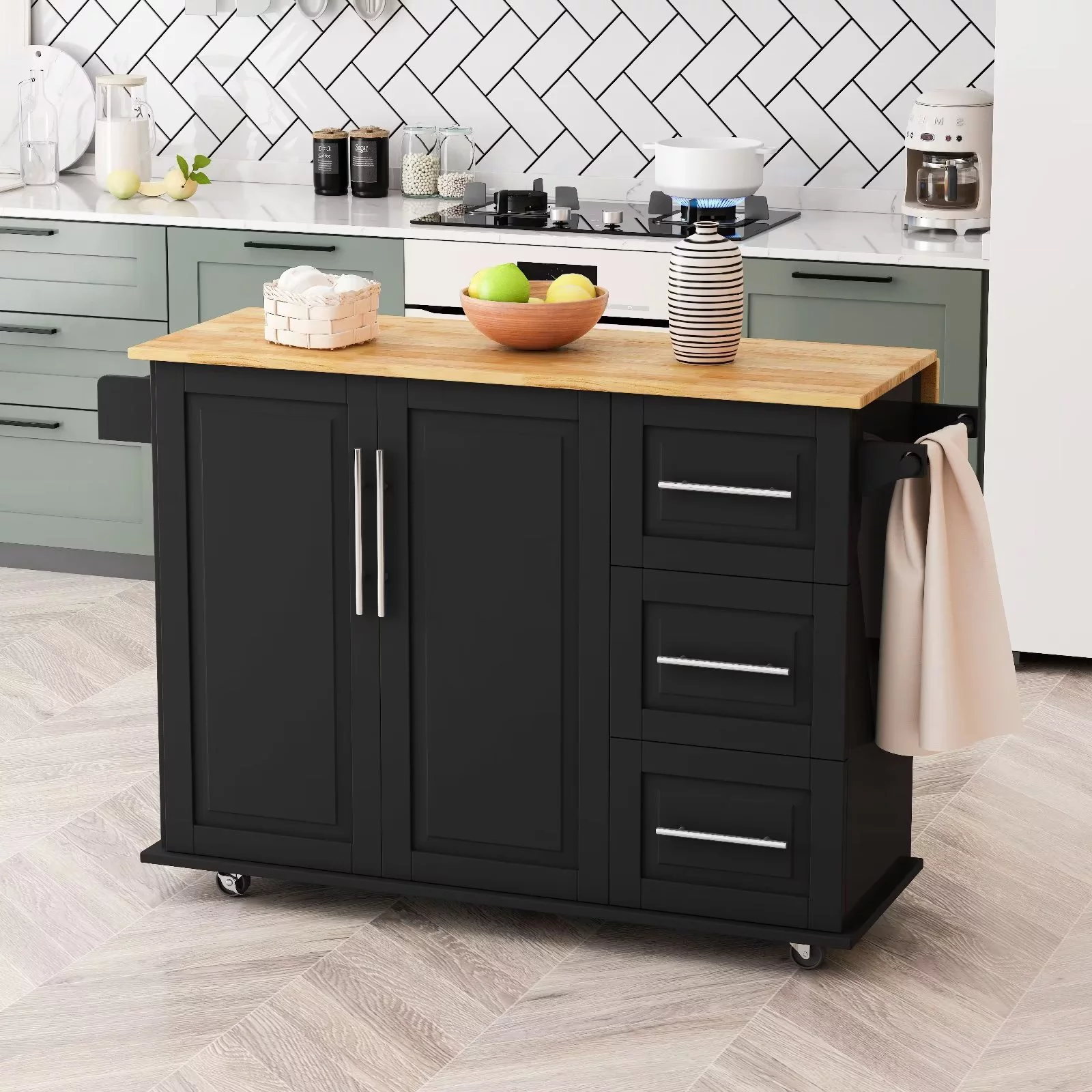 Kitchen Island, Cabinet Door Internal Storage Racks with Rubber Wood Countertop, Store Kitchen Cart on 5 Wheels with Storage Cabinet and 3 Drawers for Dinning Room, Black
