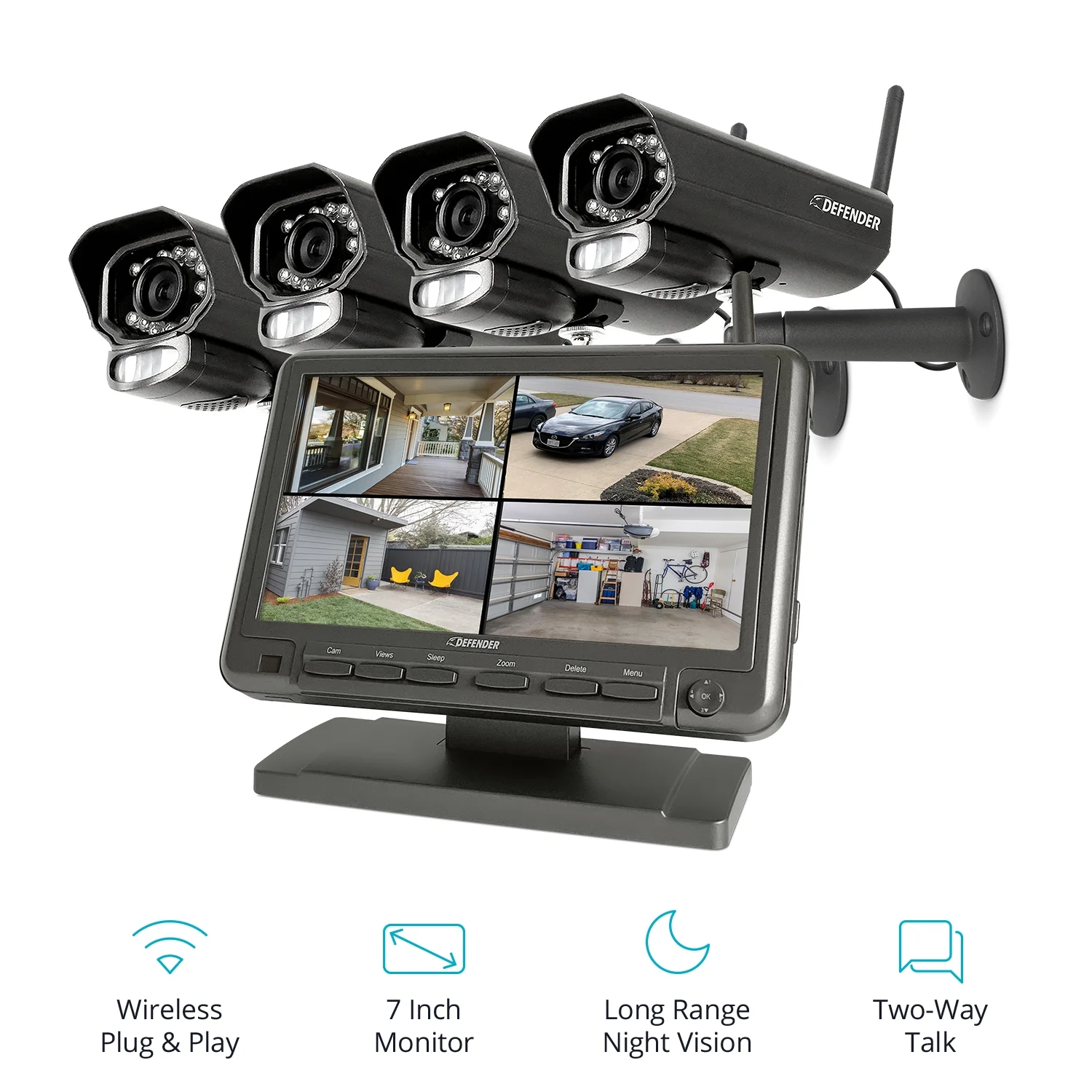 Defender PhoenixM2 Non Wi-Fi. Plug-in Power. Security Camera System with 7" Display Monitor and 4 Long-Range Night Vision Cameras, 32GB SD Card Recording, Plug & Play