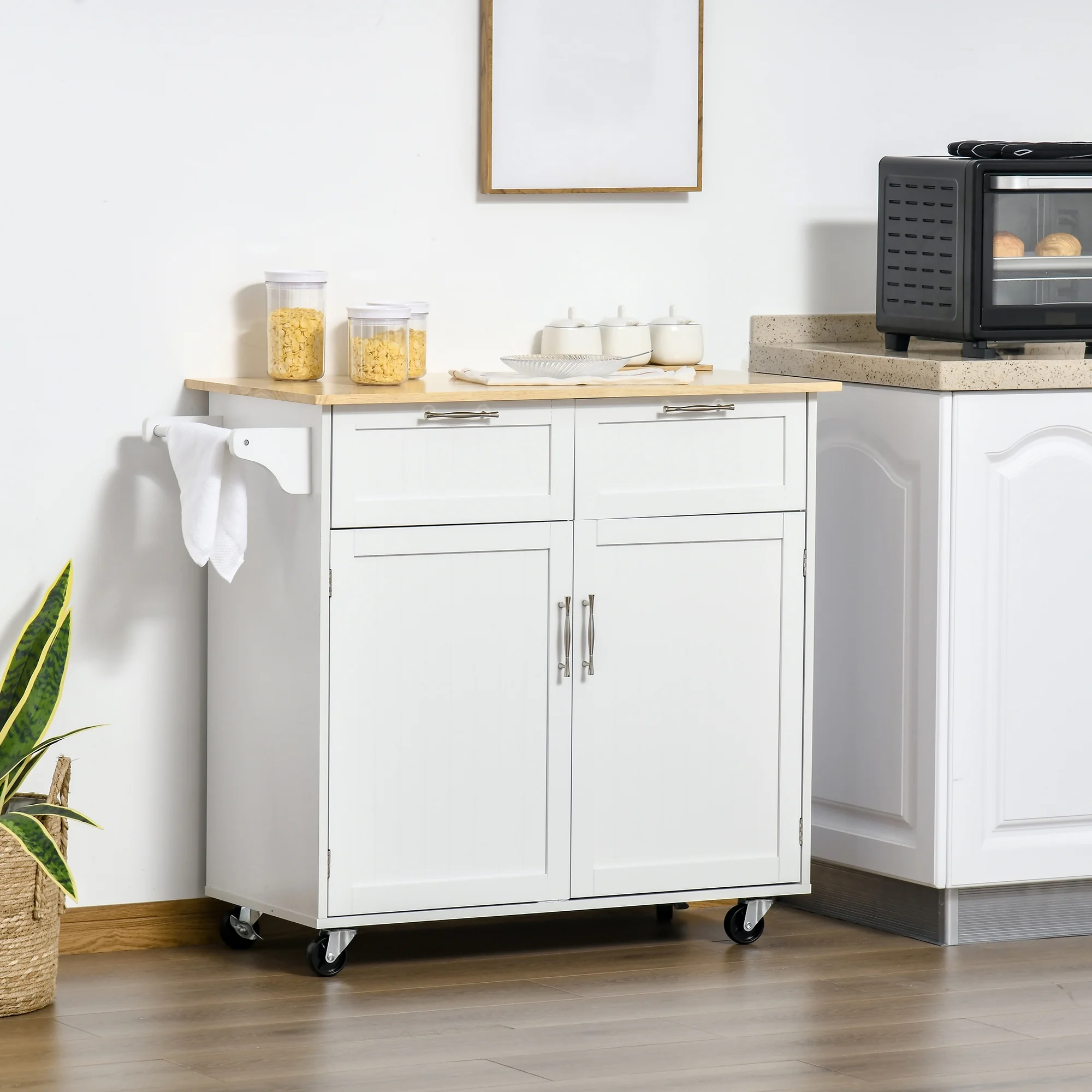 Knubmt Rubberwood Top Rolling Kitchen Island with Wheels, Utility Cart Storage Trolley with Drawers, White