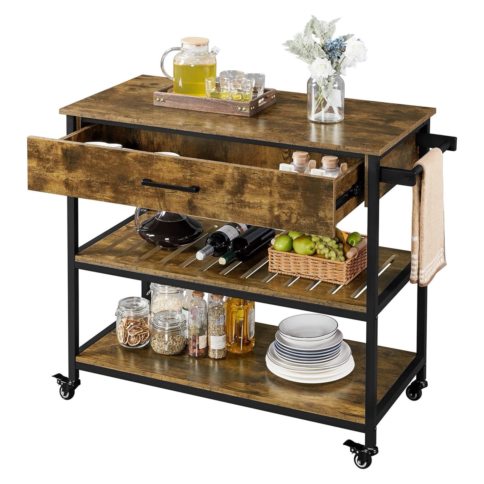 ZAWkirJ 40 Inch Mobile Kitchen Island Cart on Wheels for Home Kitchen, 40 Inch Rolling Utility Trolley Cart with Drawer and Storage Shelf, 3-Tier Large Kitchen Work Table Dining Cart, Rustic Brown
