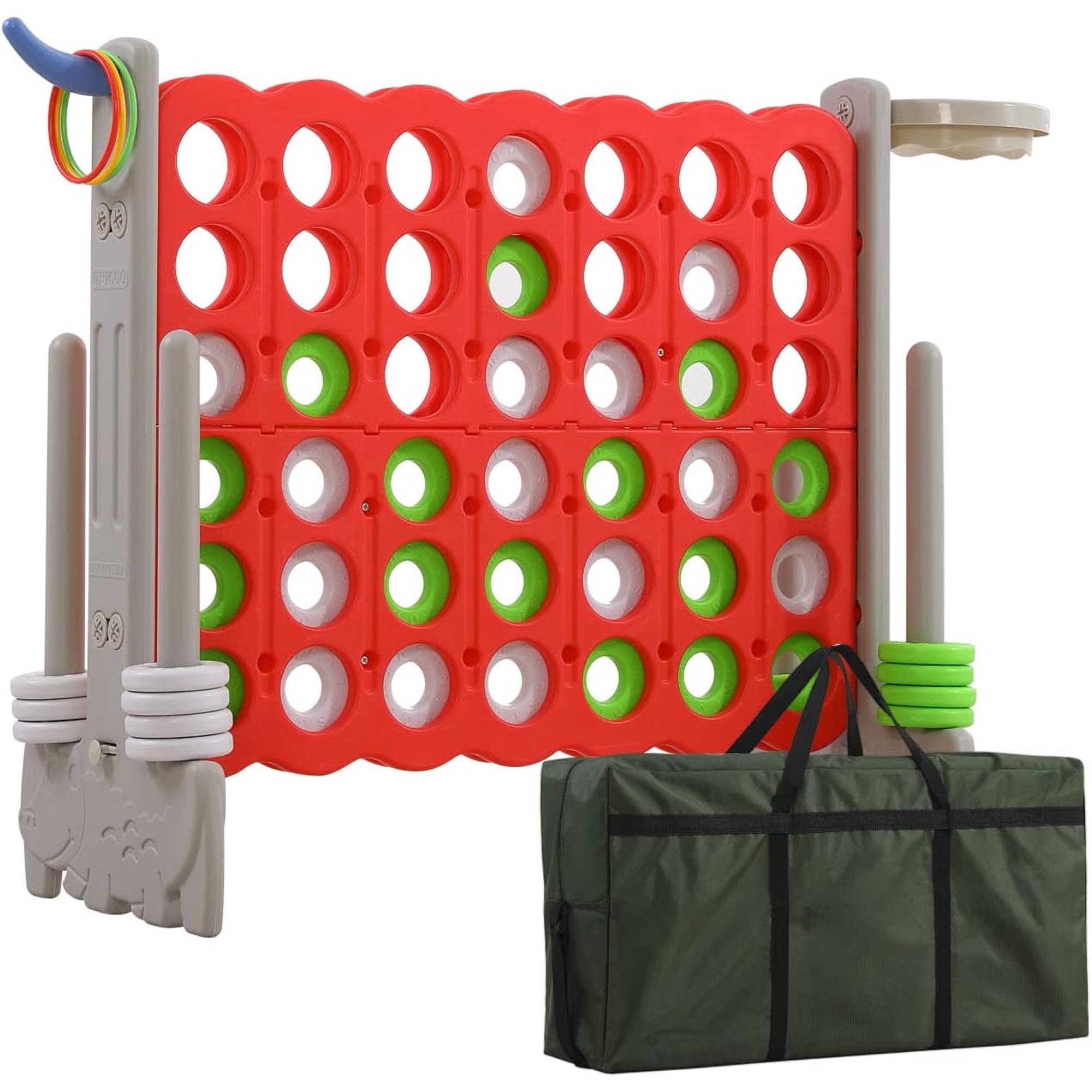 Giant 4-in-a-Row Game with Carrying Bag, Giant 4-to-Score Game Set with Basketball Hoop, Ring Toss, Indoor & Outdoor Family Party Game for Kids & Adults (Red + Grey)
