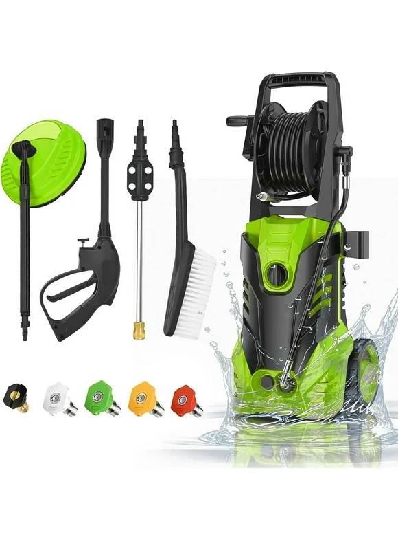 YouYeap Electric Pressure Washer, 3000 Max PSI 2.0 Max GPM Power Washer with Hose Reel, 5 Quick Connect Nozzles, Soap Tank for Cars, Fences, Driveways, Home, Patios, Green