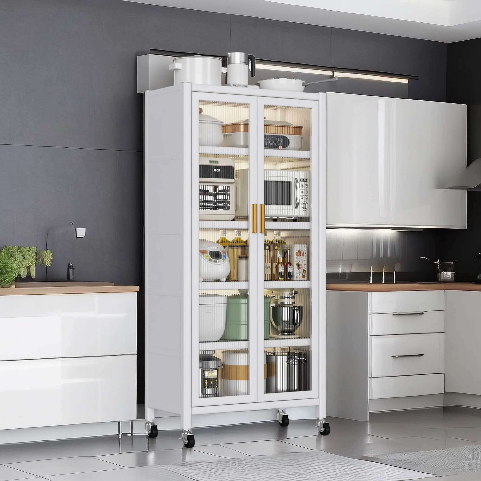Yardi Yard Floor-to-ceiling Multilevel Household Microwave Sstorage Cabinet, Bakers Racks for Kitchens with Storage, Microwave cart, Transparent Flap Door Design Kitchen Storage Shelves, White