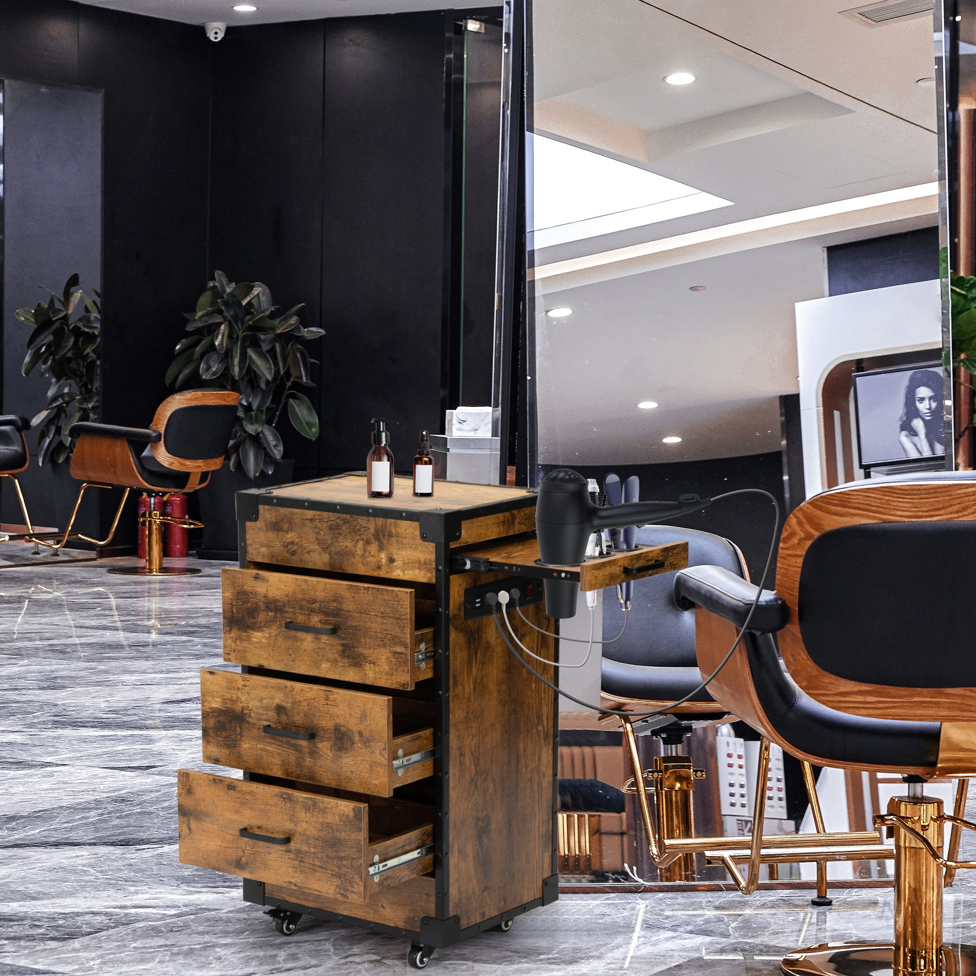 Yardi Yard Industrial Salon Beauty Styling Station, 4-Wheel Rolling Cart with Large Storage Space for Hair Dryer, Curling Iron, Hair Straightener, Brush, Comb, Salon Station