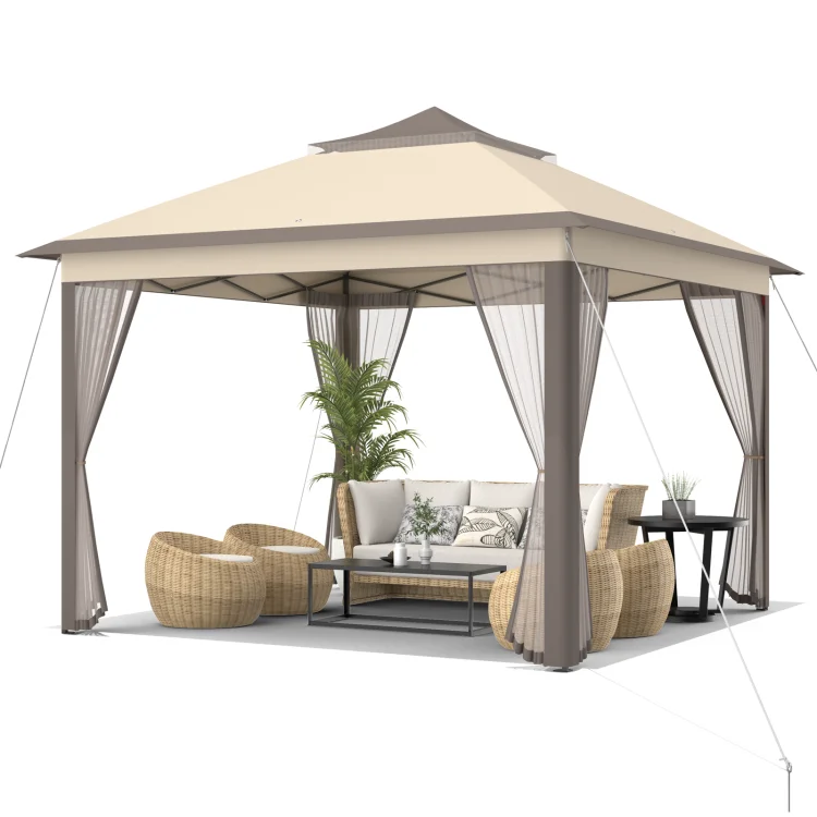 Yardi Yard 11 x 11 Feet 2-Tier Pop-Up Gazebo Tent Portable Canopy Shelter Carry Bag Mesh-Brown, Party Tent for Outside Party Waterproof Tent BBQ Shelter