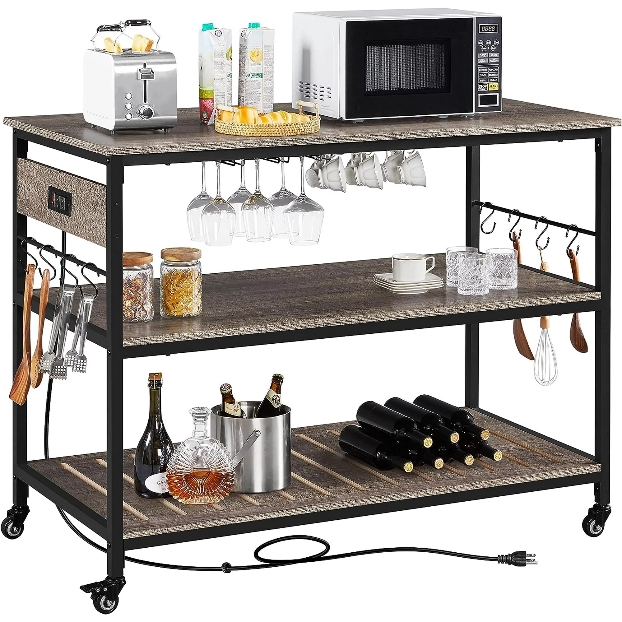 Yaheetech Kitchen Cart with Power Outlet, Rolling Kitchen Island on Wheels with Glass Holder & Hooks, Utility Trolley Cart Coffee Bar Microwave Stand Cart with Lockable Casters, Taupe Wood