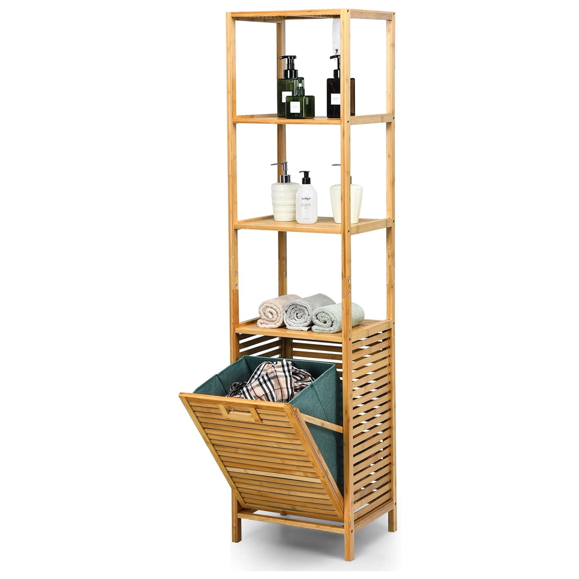 63'' Tilt Out Laundry Hamper and 4-Tier Storage Shelves, Removable Clothes Basket with Easy Carry, Bamboo Tower Hamper Organizer, Great for Bathroom, Bedroom, Laundry Room, Closet, Nursery