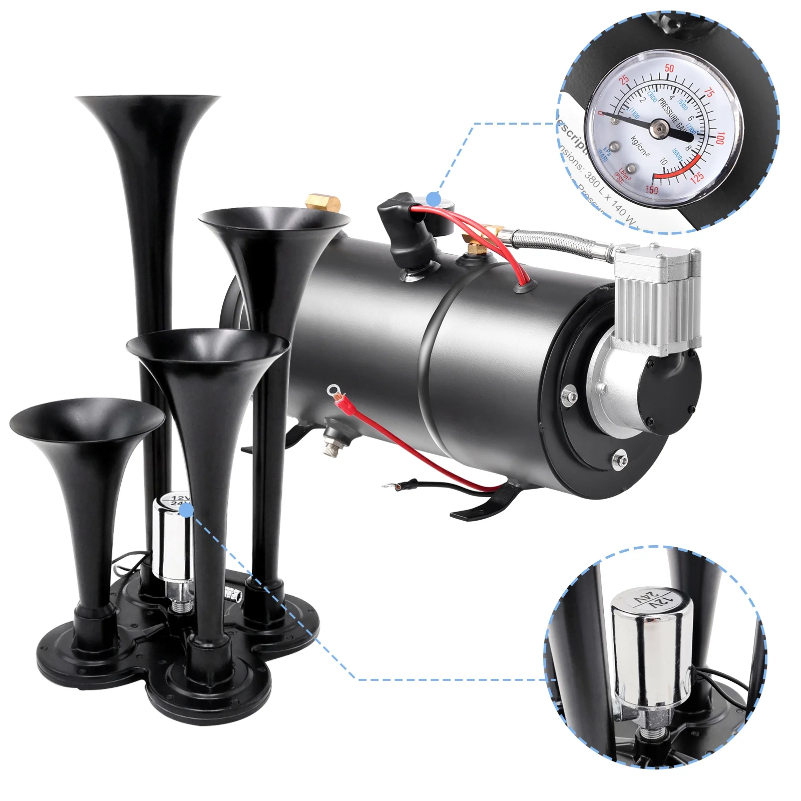 WZTO Train Horns Kit | 0.8 Gal 4 Trumpet Air Horn Kit 150DB for Truck | 12V 150psi Air Compressor Tank for Any 12V Vehicle, Car, Truck, Train, Van, Boat
