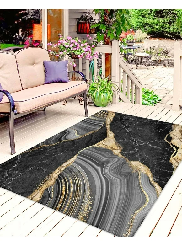 Abstract Marble Outdoor Patio Rug for Deck,Picnic,Porch,Balcony 5x8ft Water Absorb Non Skid Area Rugs, Black Gold Aesthetic Agate Washable Camping RV Carpet Mats Nature Art Fluid