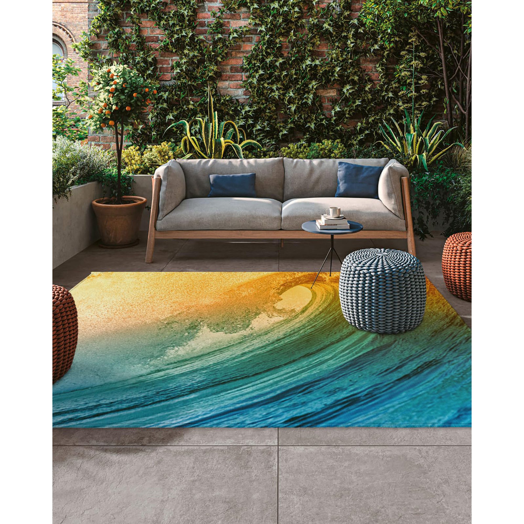 5x8 Outdoor Rug Waterproof for Patio Ocean Wave,Washable Outdoor Carpet Large Area Rug Teal Yellow Patio Rug for Porch,RV,Picnic,Backyard,Balcony,Beach