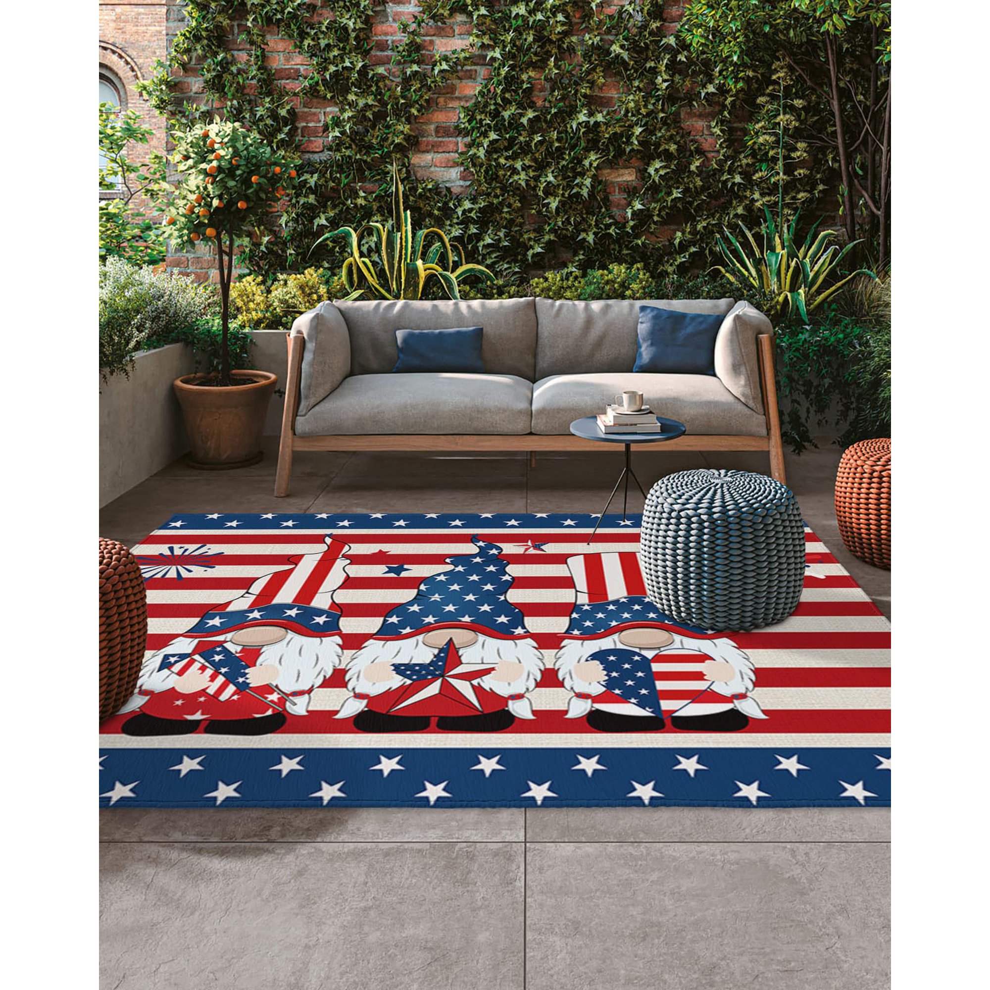 5x8 Outdoor Rug Waterproof for Patio July 4th American Flag Gnomes,Washable Outdoor Carpet Large Area Rug Strip and Star Patio Rug for Porch,RV,Picnic,Backyard,Deck,Balcony,Beach