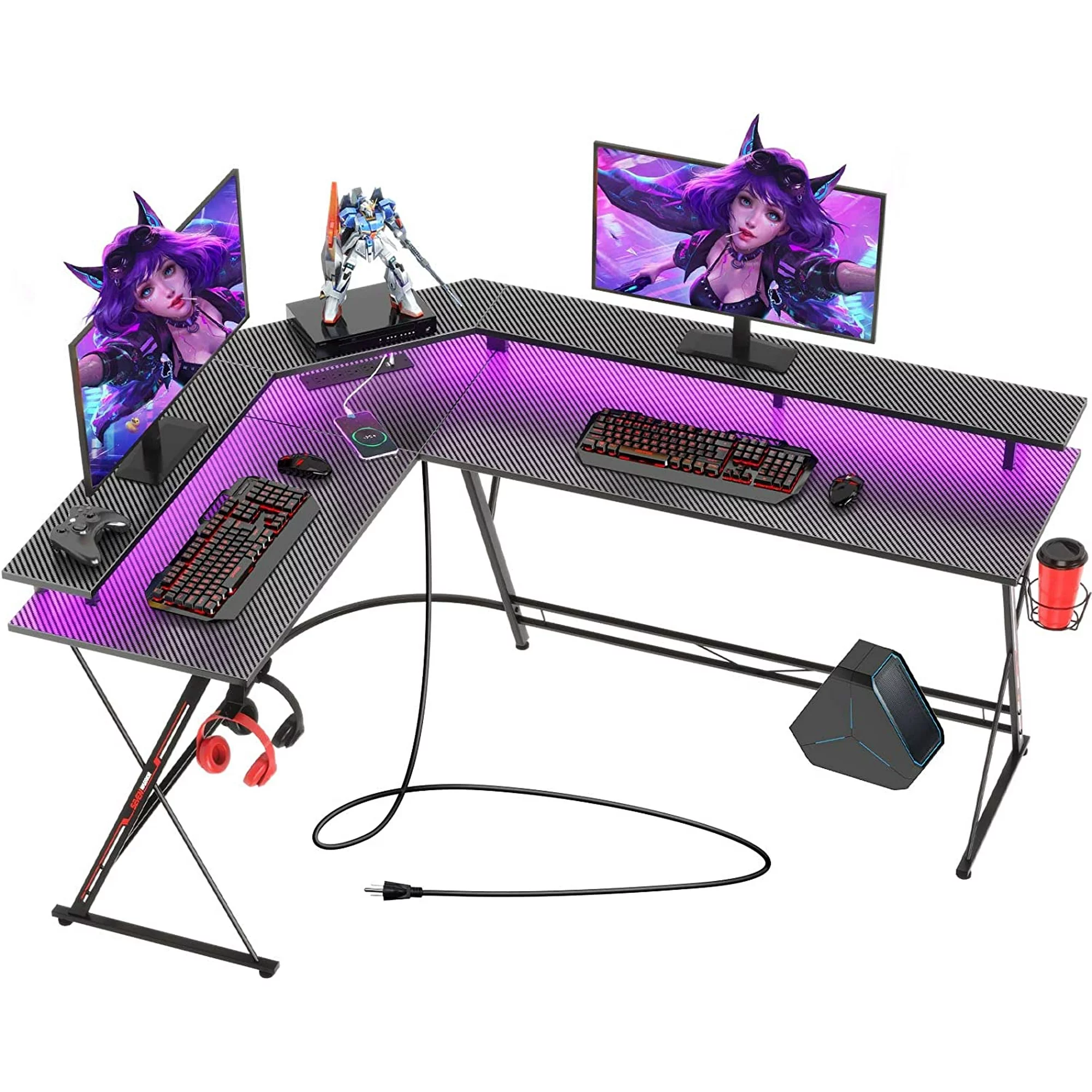 58" Shaped Gaming Desk - LED Lights & Power Outlets - Carbon Fiber Surface - Corner Design - Cup Holder - Hooks - Black