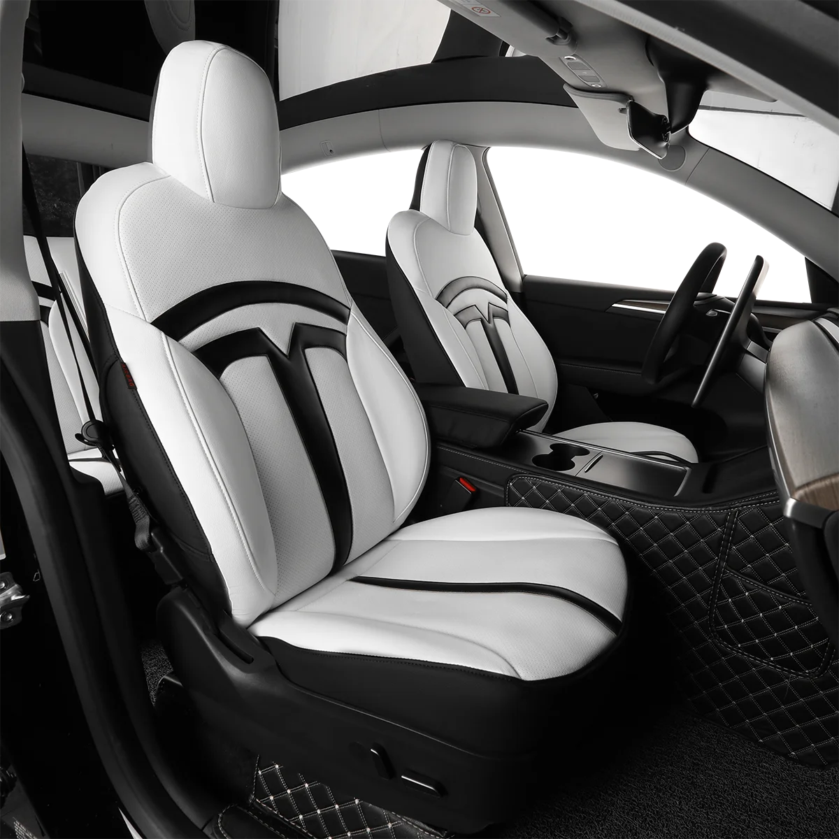 EKR Custom Fit Model Y Car Seat Covers for Tesla Model Y 2019 2020 2021 2022 2023 2024 - Full Set Breathable Leather Auto Seat Covers (Black/White)