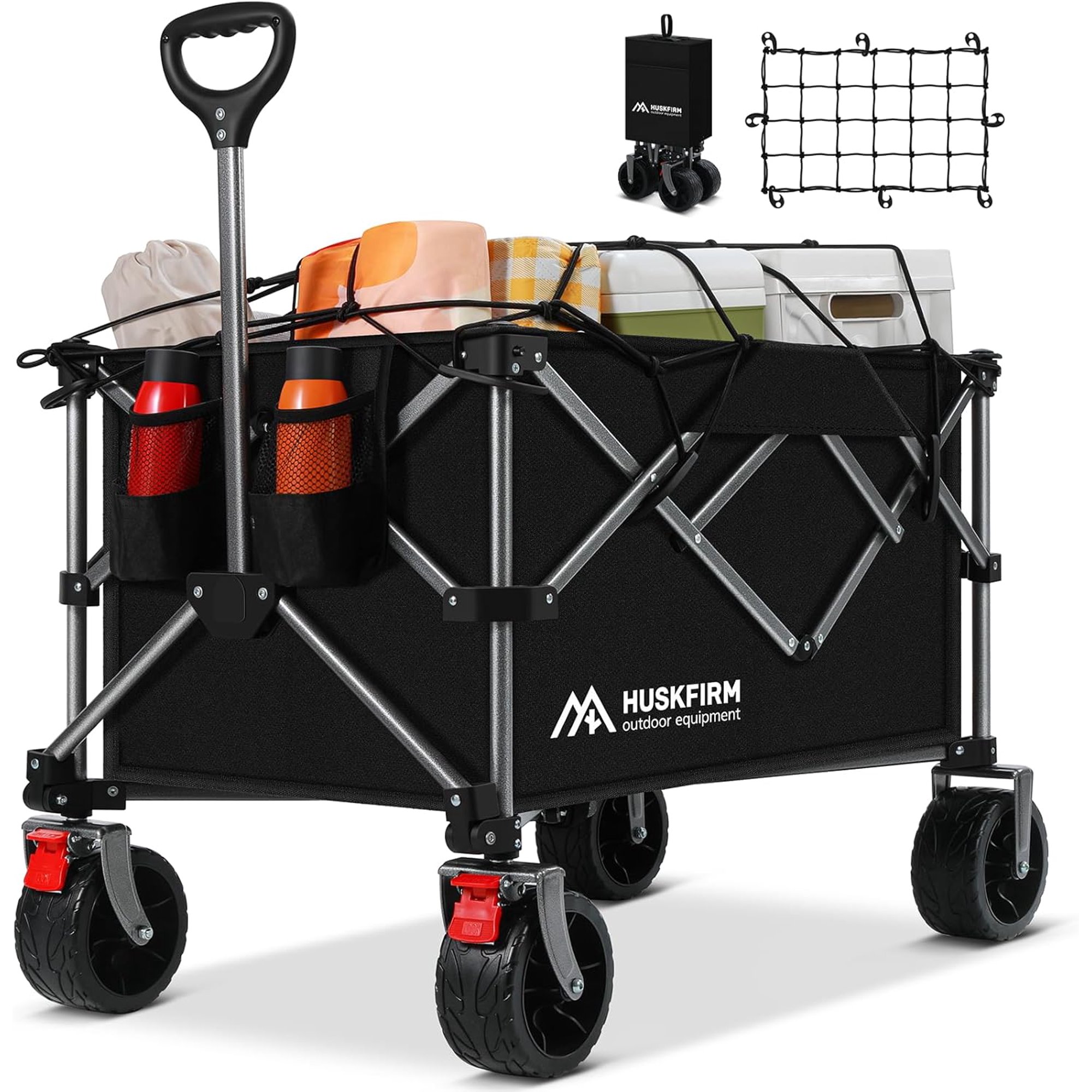 280L Collapsible Beach Wagon with Big Wheels for Sand Heavy Duty Wagons Carts Foldable All Terrain Wagon for Camping Sports Shopping Garden Outdoor Activities-Extra Cargo Net (Black)