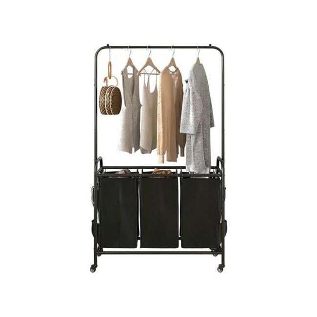 3 Bags Laundry Sorter with Garment Hanging Bar Laundry Hamper Rolling Cart & Basket Organizer - Lockable Wheels 3 Removable Bags, Black - Unisex