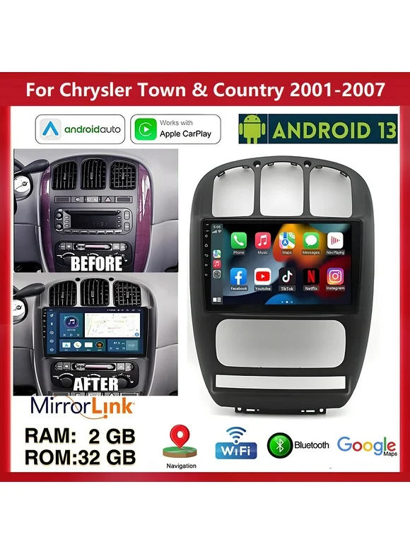 Car Radio for Chrysler Town & Country 2001-2007, 10 inch Touch Screen Android 13 Stereo, Carplay/Android Auto/EQ Audio/Bluetooth/SWC