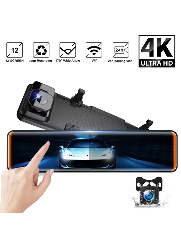 Car Recorder Camera 4K 12" Mirror Dash Cam DVR Video Recorder Rear View Mirror Camera Rearview Mirror for Cars with Night Touch Screen