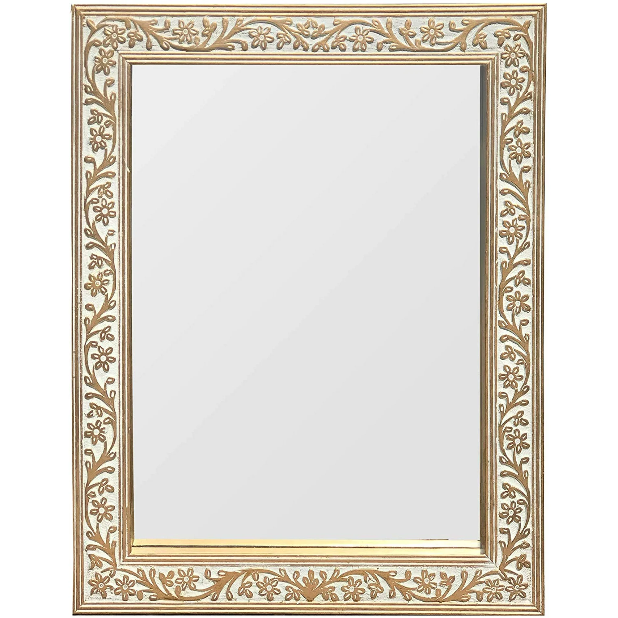 DecorShore 30 x 24 in Genuine Hand-Carved Mango Wood Rectangular Wall Mirror Vintage Scroll Pattern Carving in Rustic White - Gold Patina Finish