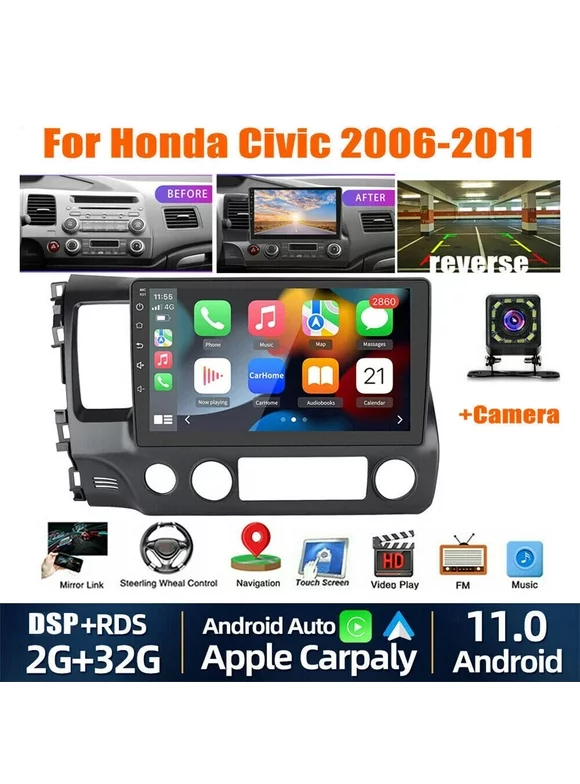 Car Stereo Radio with CarPlay Android Auto for Honda Civic 2006-2011, 10.1'' HD Touch Screen in-Dash GPS Navigation, Android 11, Mirror Link, Bluetooth, WiFi, 2G+32G
