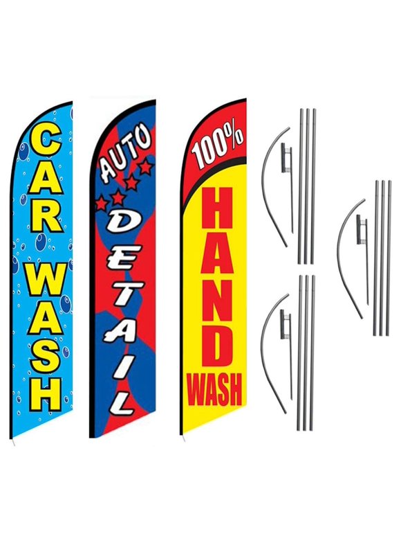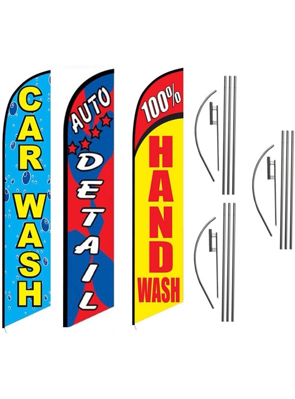 Car Wash Auto Detail 100% Hand Wash Package of 3 Advertising Feather Banner Swooper Flag Kits with Ground Spikes