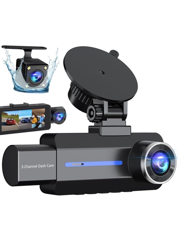 3 Channel 2.5K Dash Cam, 1440P Dash Cam Front and Rear Inside, Dash Camera for Cars, Triple Car Camera with 32GB Card, G-Sensor, 24Hr Parking, Loop Recording, IR Night Vision, Blue