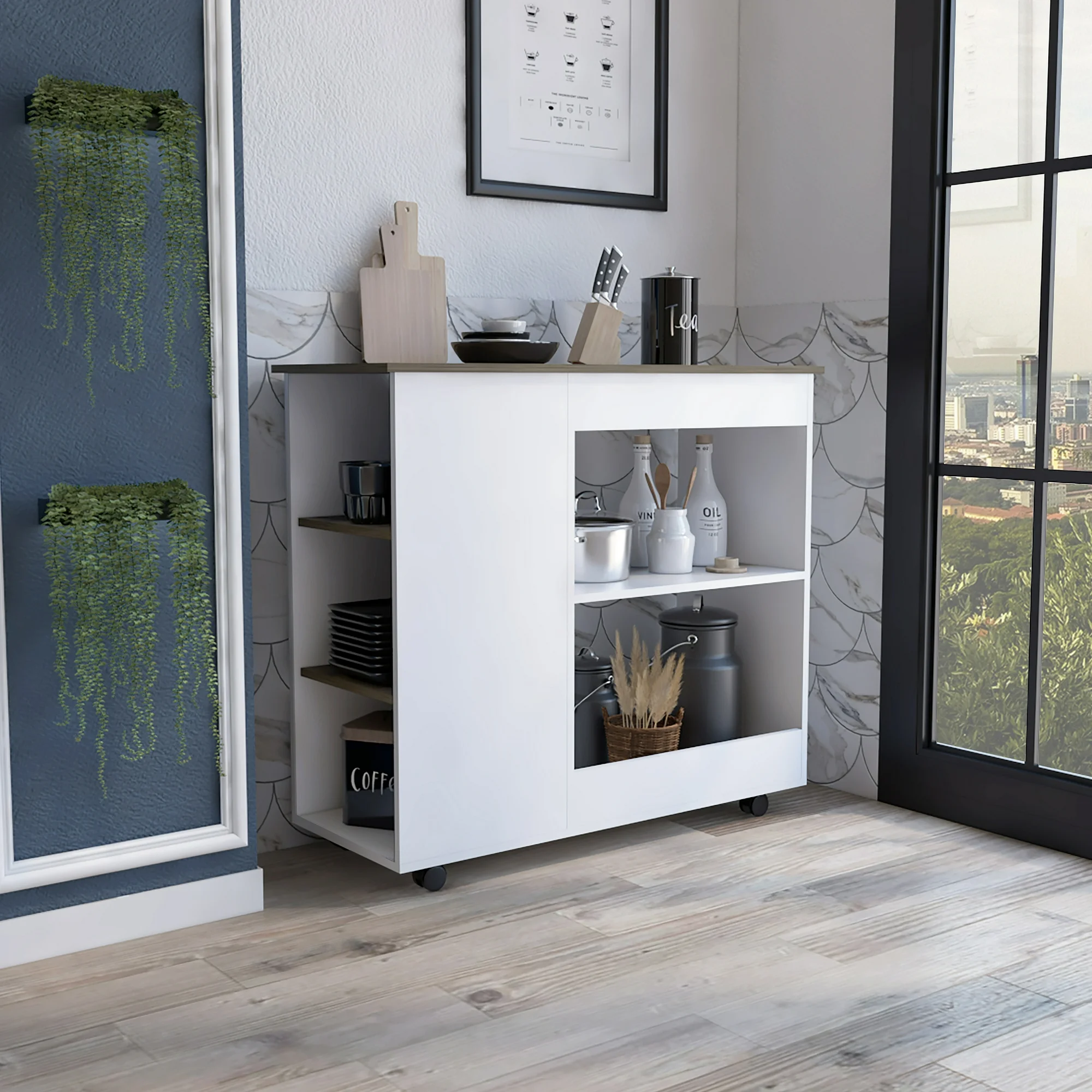 Cterwk Wood Top Kitchen Island with 2 Shelves and Wheels, Kitchen Cart with 3 Side Shelves, White