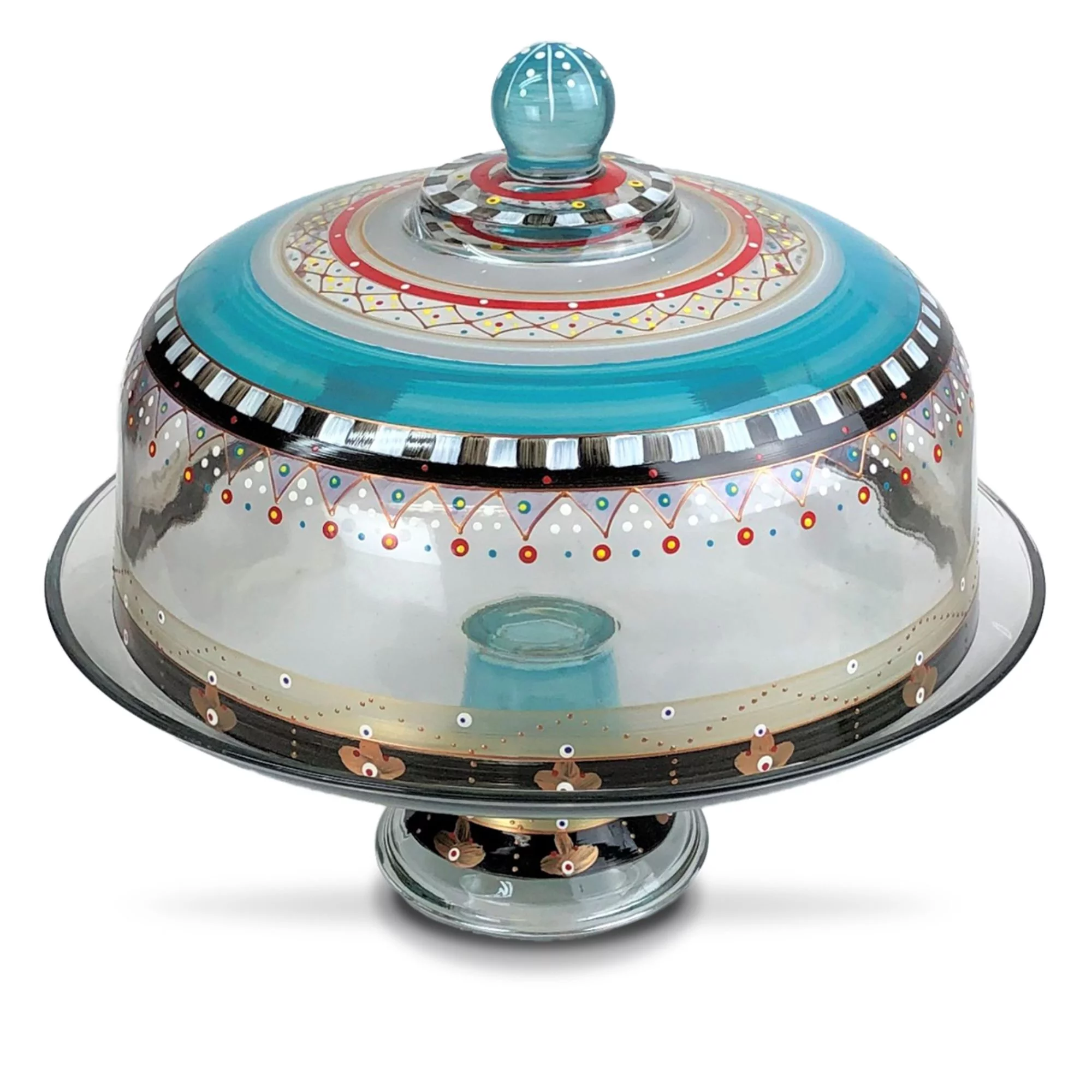 Crafted Creations 11" Blue Mosaic Carnival Confetti Hand Painted Glass Convertible Cake Dome