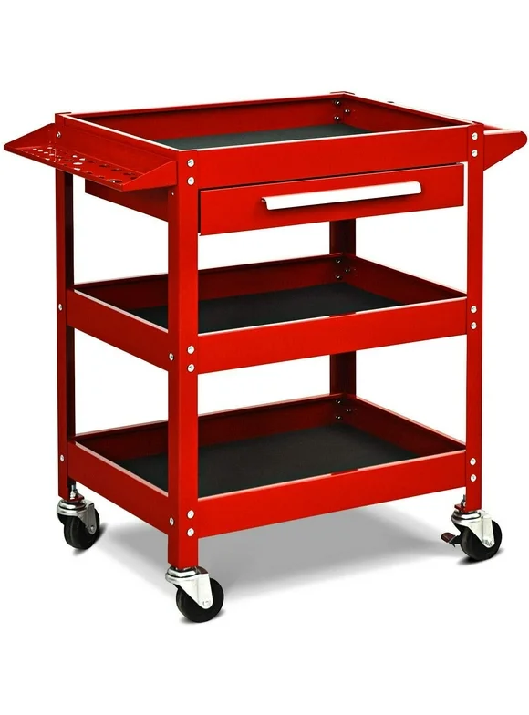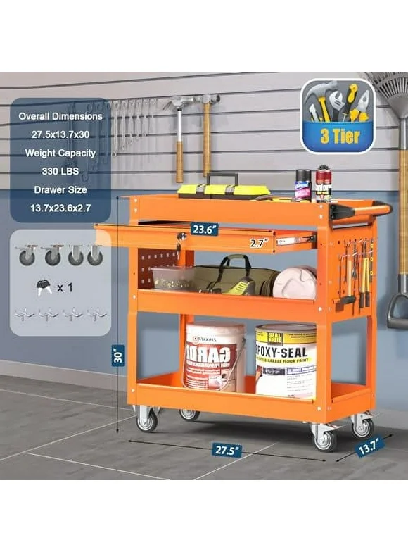 3 Tier Rolling Tool Cart, 330 LBS Capacity Heavy Duty Utility Cart Tool Organizer with Storage Drawer, Industrial Commercial Service Tool Cart for Mechanics, Garage, Warehouse & Repair Shop
