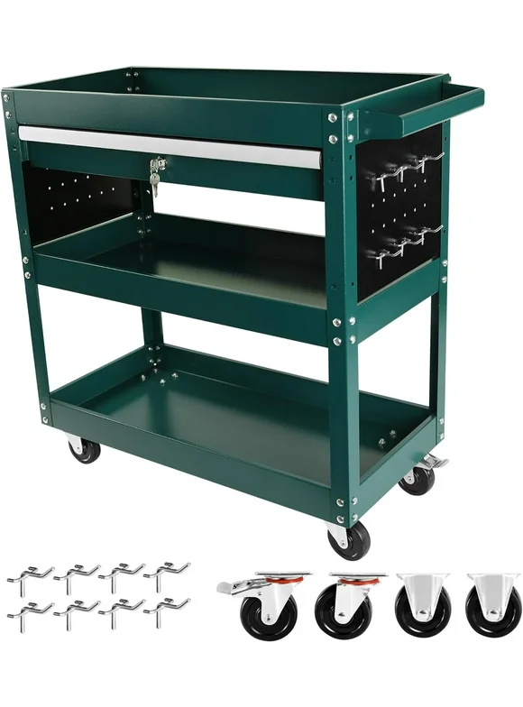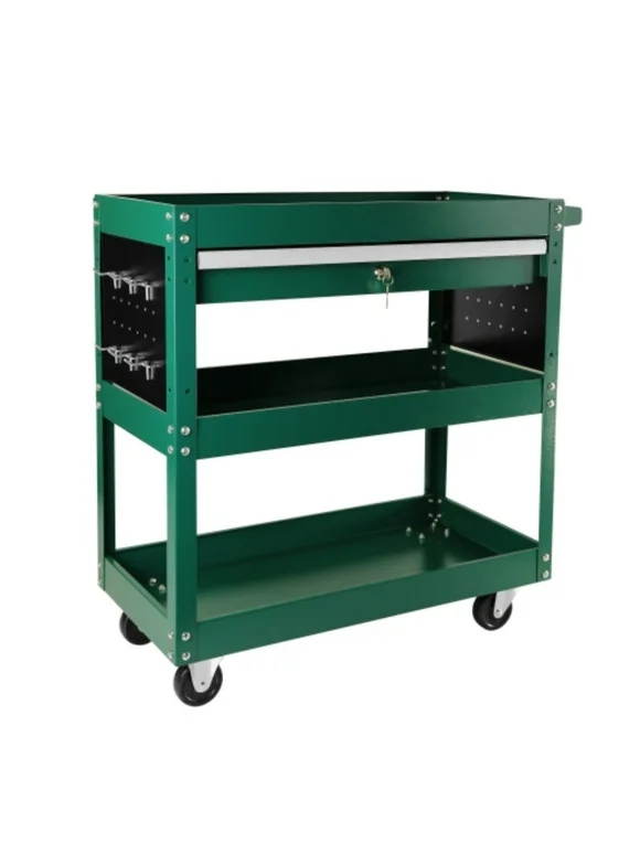 3 Tier Rolling Tool Cart, Heavy Duty Utility Cart Tool Organizer with Storage Drawer, Industrial Commercial Service Tool Cart for Mechanics, Garage, Warehouse & Repair Shop,Green