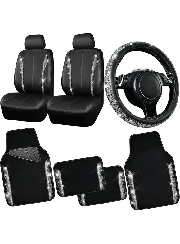 Diamond Leather Bling Car Seat Covers Front & Waterproof Rhinestone Car Floor Mats 4Pcs & Sparkly Steering Wheel Cover 15' Universal Shining Interior Sets For 95% Suv Cute Women Black Silver