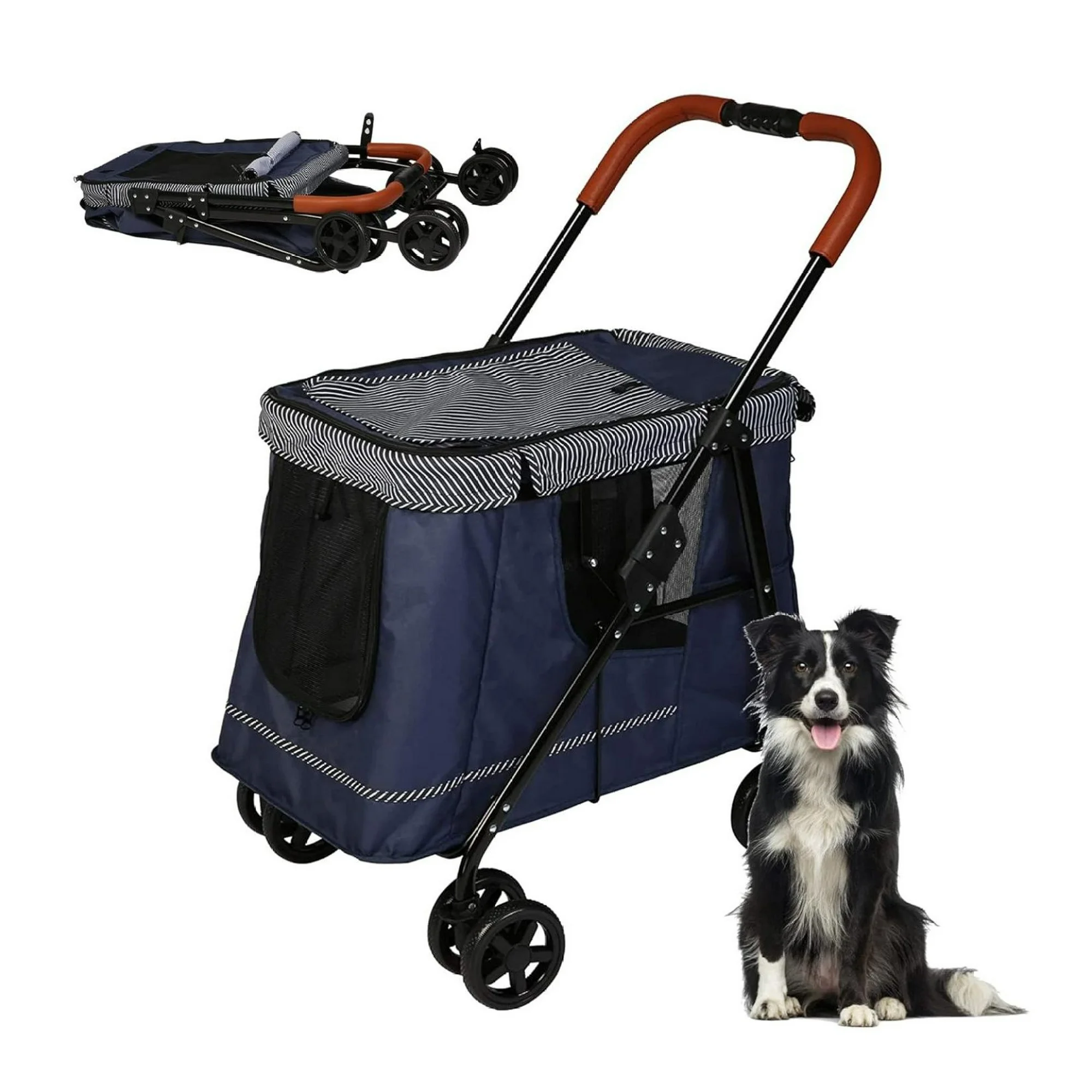 Pet Wagon Double Dog Stroller for Large Dogs or Multiple Dogs Cats with 4 Wheels, Dog Cat Cart with Dual Entry Portable Quick One-Step Folding Travel Cart, Dark Blue