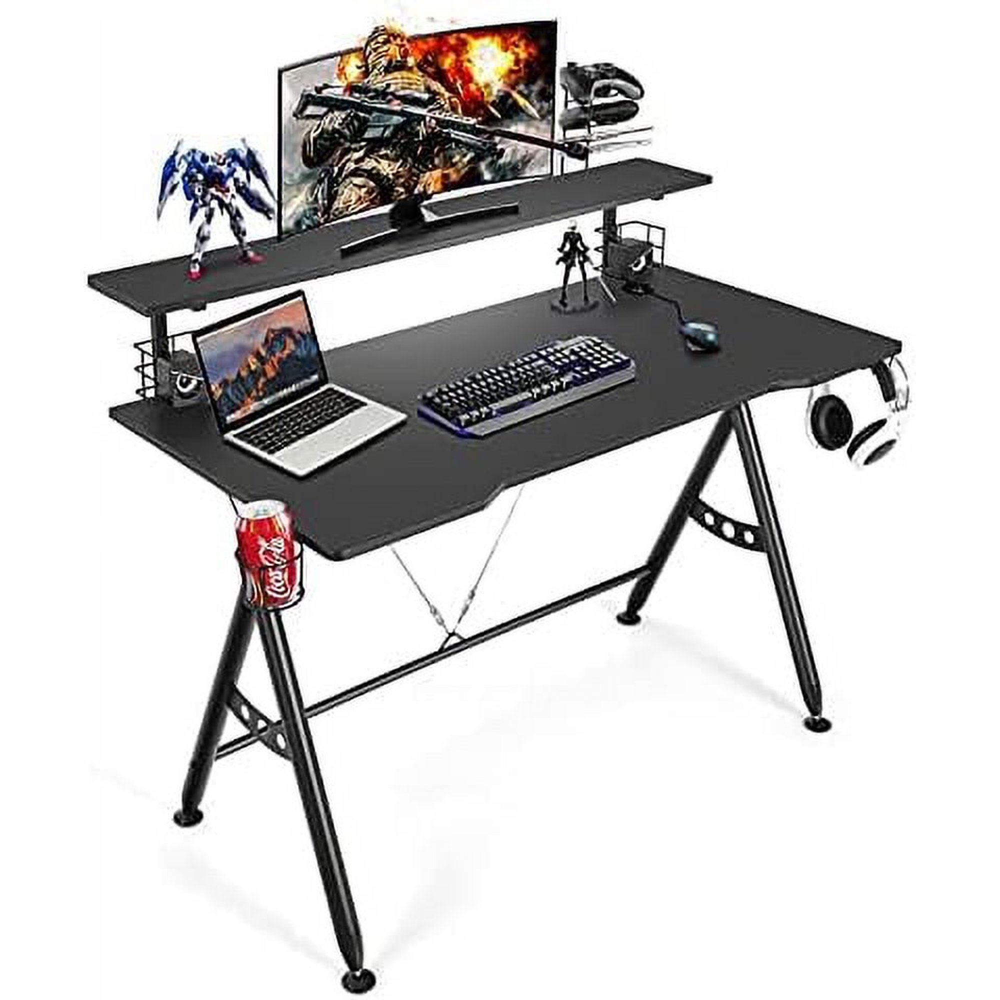 YPDCHB Gaming Desk Ergonomic Computer Desk w/Monitor Game Handle Rack Cup Holder Headphone Hook & Speaker Stand Home Office Gamer Workstation w/Carbon Fiber Surface (Black)