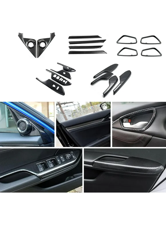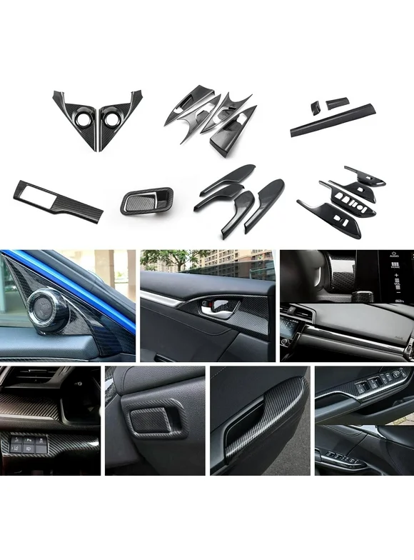 Xotic Tech Interior Armrest Stripe Window Switch Handle Bowl Panel Pillar Speaker Cover Trim Combo Kit , Carbon Fiber Pattern , Compatible with Honda Civic Sedan 2016-2021