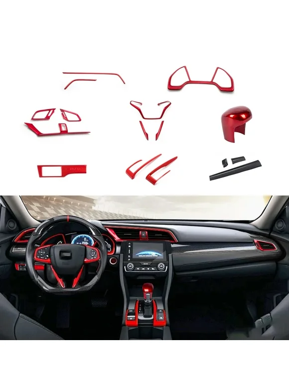 Xotic Tech Interior Dashboard Panel Steering Wheel Frame AC Vent Stripe Gear Shift Knob Cover Trim Combo Kit , Red + Carbon Fiber Black , Compatible with Honda Civic 2016-2021