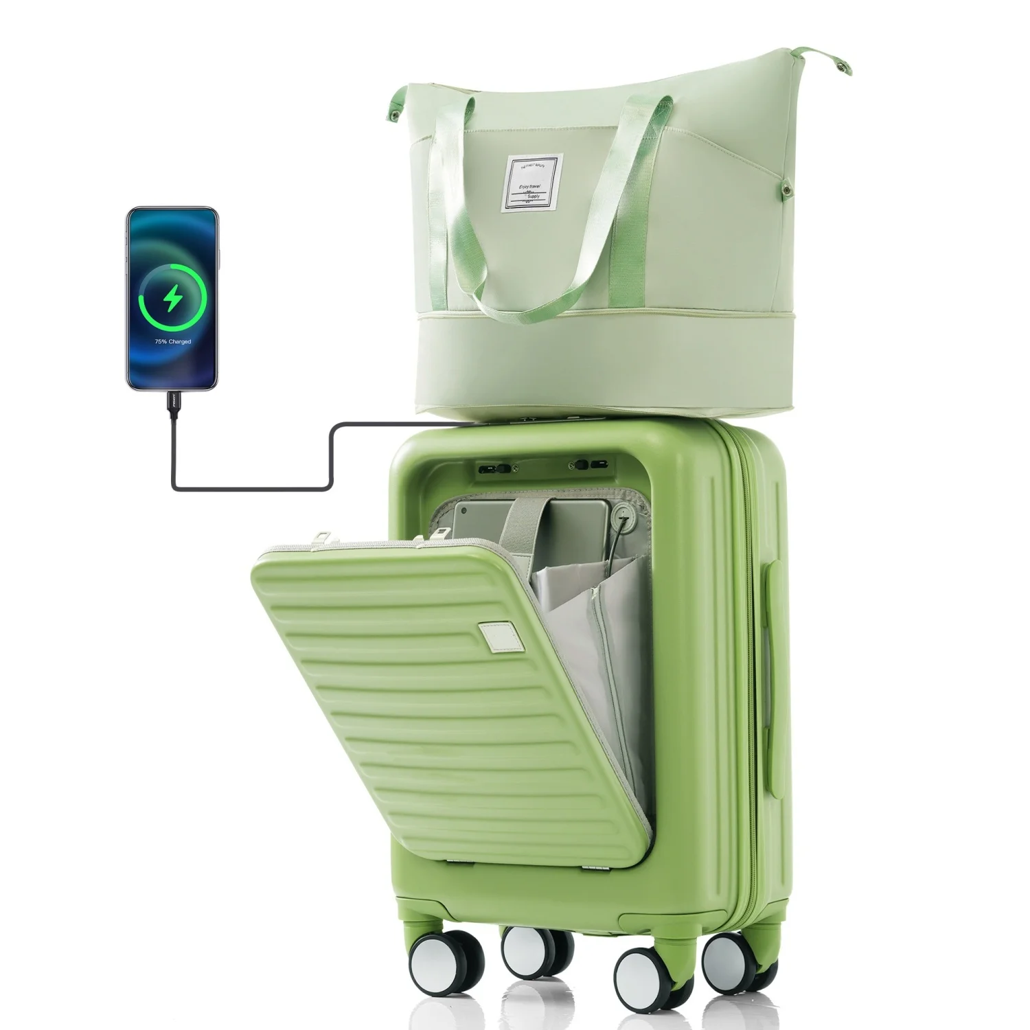 Convenient Two-Piece Suitcase Set with Expandable Light Green ABS Hard Shell Front Opening 20-Inch Carry-On Luggage with USB Port and Cup Holder - Ideal for Easy Travel