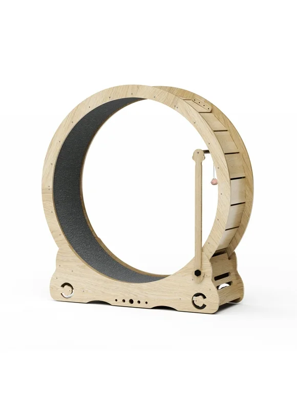 Cat Exercise Wheel - Indoor Cat Treadmill With Carpeted Running Track, Cat Exercise Wheel With Teaser Equipment, Safety Cat Treadmill With Locking Latch, Natural Wood
