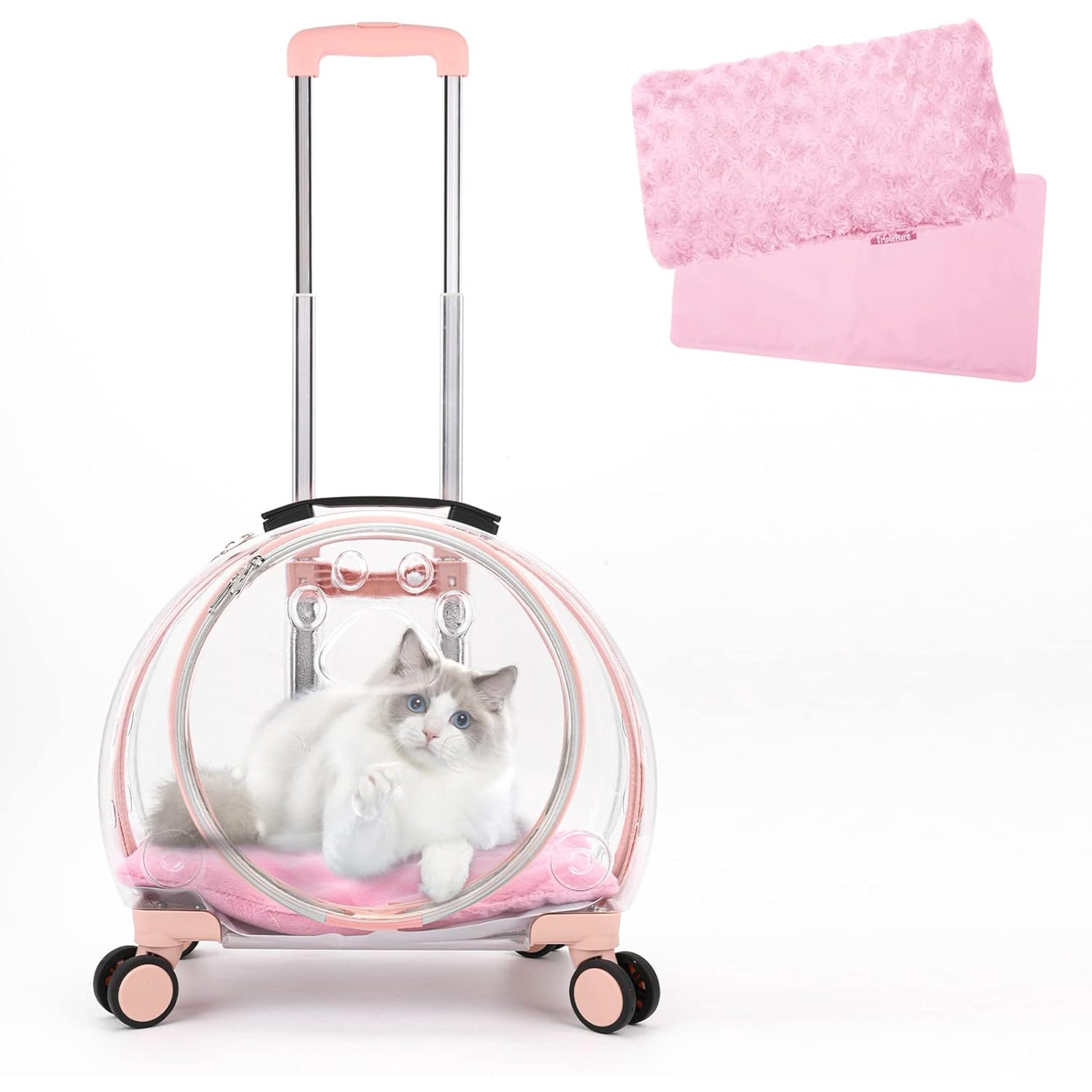 Transparent & Fully Breathable Pet Carrier Backpack with Trolley Wheels for Dogs, Cats, Parrots or Bunnies, Multiple Carrying Options, Perfect for Traveling/Taking a Walk (Pink)