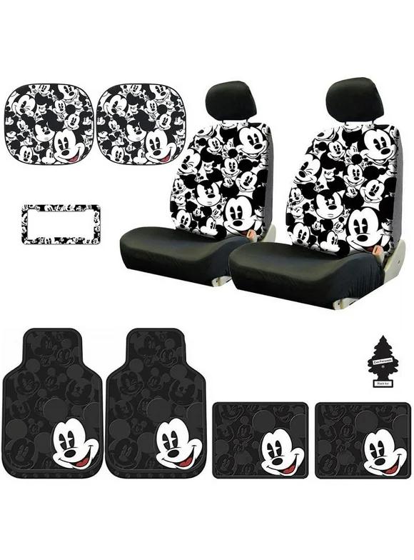 Disney Mickey Mouse Design Low Back Car Seat Covers Spring Shades Floor Mats License Plate Frame Accessories Set with Air Freshener