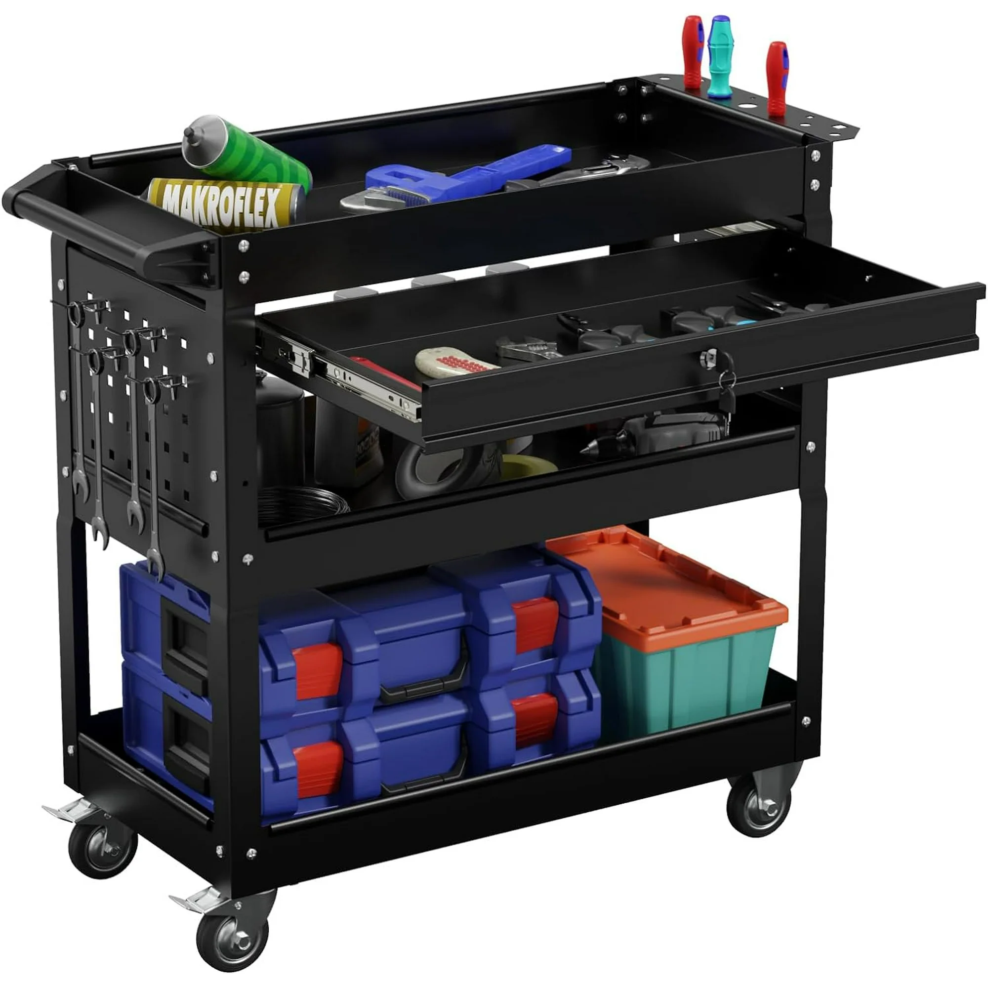 YPDCHB 330-Pound Capacity Rolling Tool Cart with Drawer 3-Tier Heavy Duty Service Utility Cart ZXCERT Organizer with Wheels and Metal Locking for Warehouse Garage (Black)