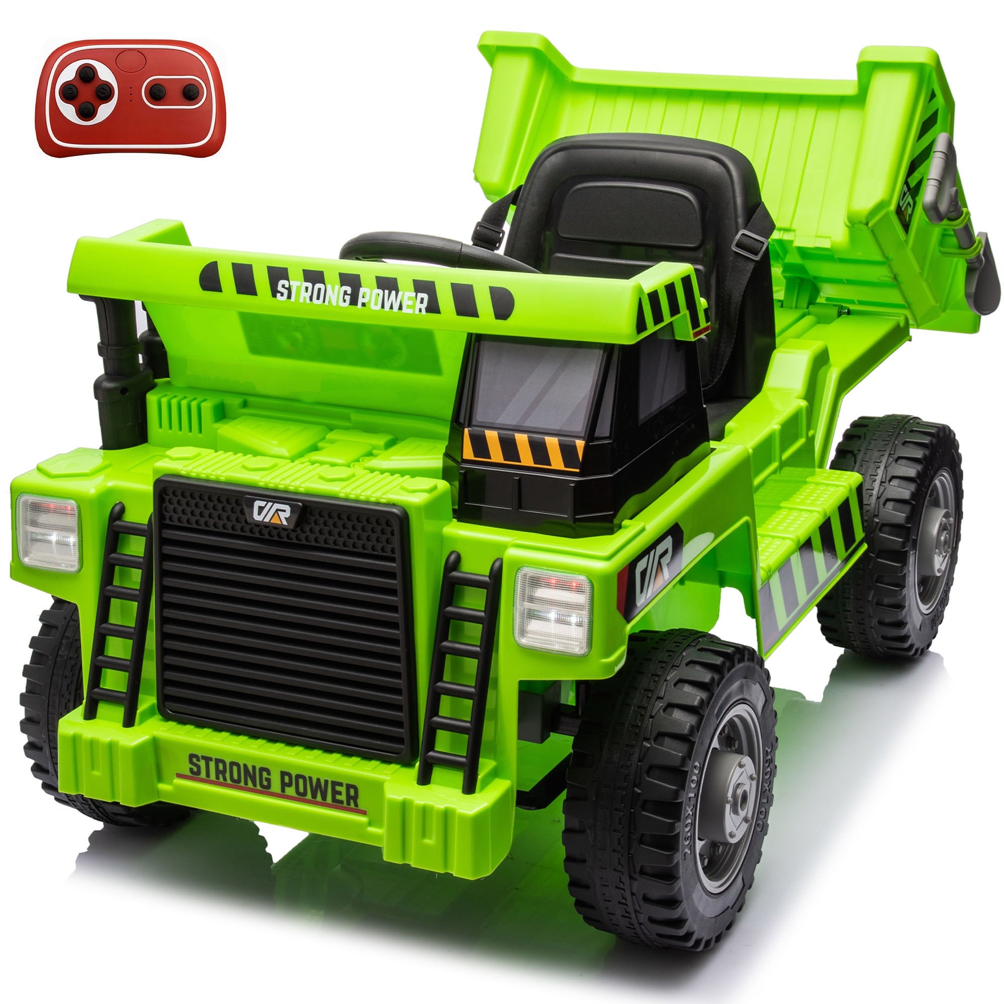 Remote Control Dump Truck, Electric Car for Kids with Electric Dump Bed and Extra Shovel, Music, Seat Belt, Forward/Reverse Function, Front Lights, 12V Ride on Car for Boys Girls - Green