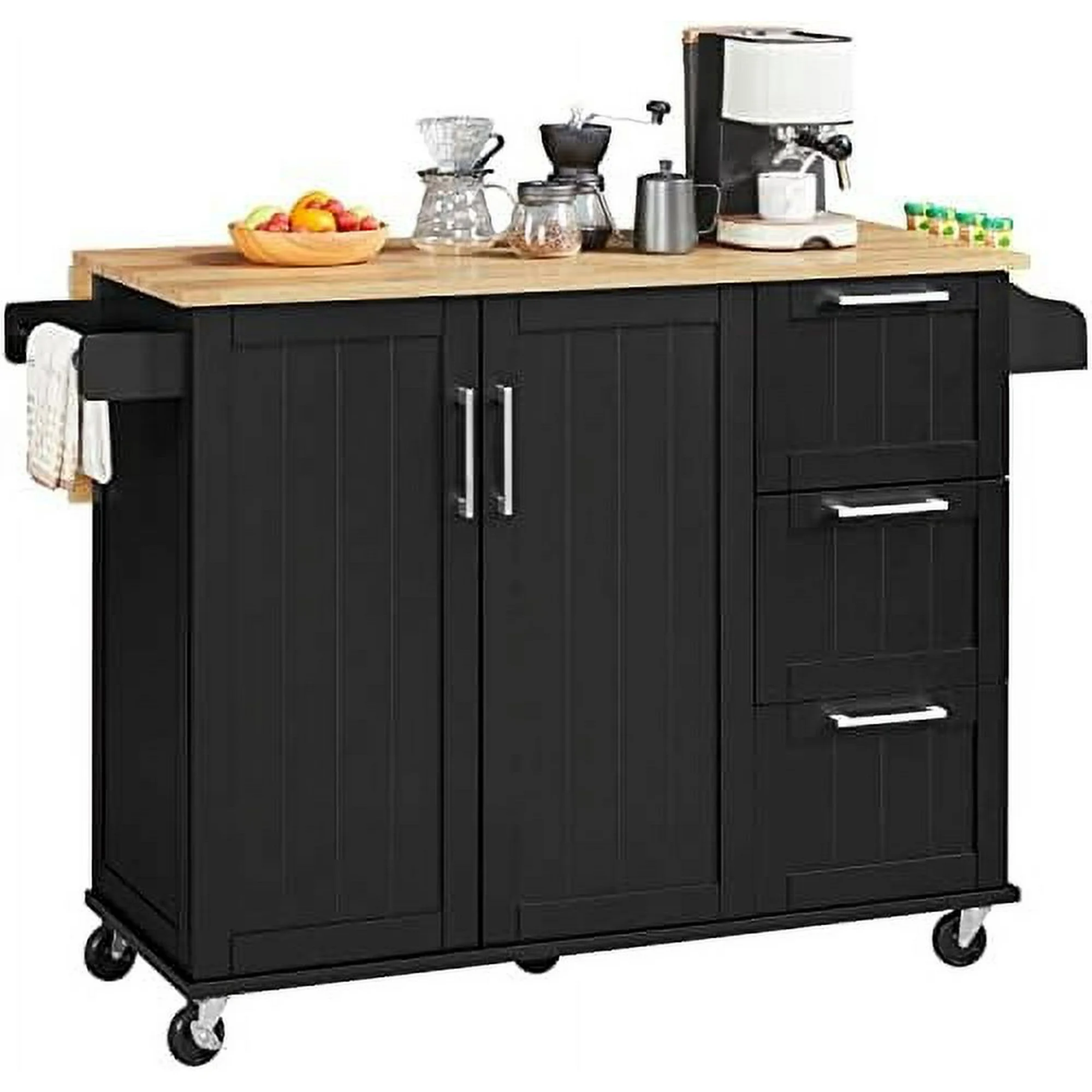 LNSETGC Kitchen Island Cart with Drop-Leaf Countertop Rolling Kitchen Island Breakfast Table on Wheels with Cabinet & 3 Drawers & Spice Rack for Dinning Room 53 Inch Width Bl