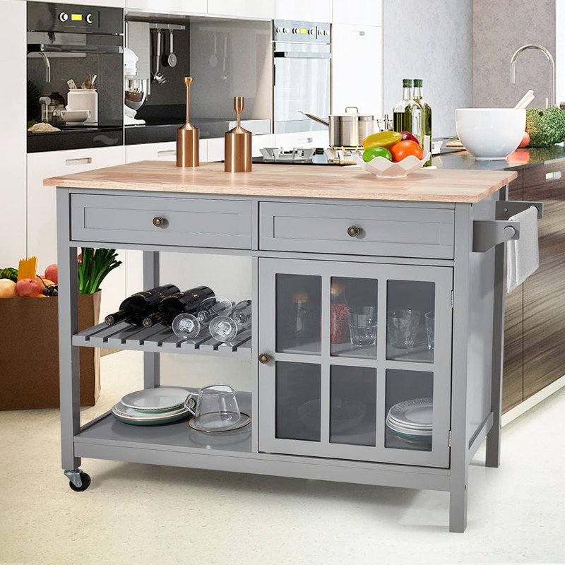 Rolling Kitchen Island Cart with Storage, 42 Inch Wood Tabletop Kitchen Cart w/ 2 Wheels, Trolley Cart Utility Glass Cabinet, Towel Rack, Open Display Shelf, Grey